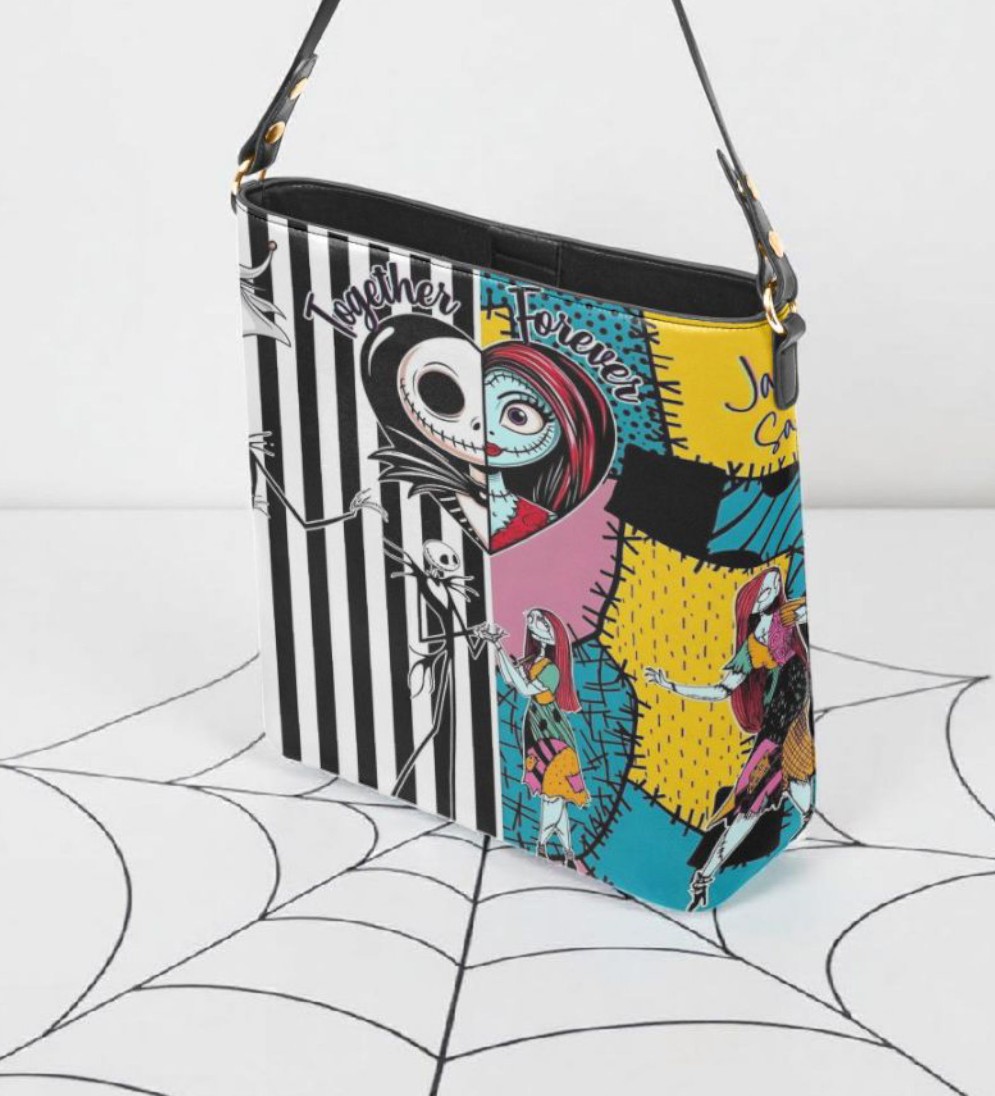 Nightmare Before Christmas Jack & Sally Pop Art Patchwork Leather Bucket Bag | Free Ship JTPRT
