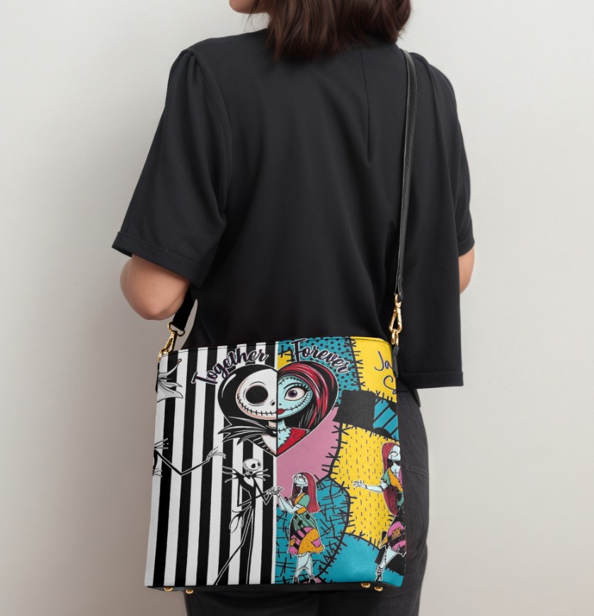 Simply meant to be! This eye-catching bucket bag celebrates the eternal love story of Jack Skellington and Sally with a bold pop art twist. The vibrant patchwork design features iconic scenes and imagery from Tim Burton's beloved classic in electric yellow, hot pink, turquoise, and black against dramatic black and white stripes. Jack and Sally's "Together Forever" moment takes center stage, surrounded by colorful comic-style panels that capture the whimsical darkness of Halloween Town. The quality construction includes a black leather-look exterior with gold hardware and an adjustable shoulder strap. Dimensions: 11.02in x 11.81in x 4.53in - perfect for daily use while showing your love for Burton's masterpiece!