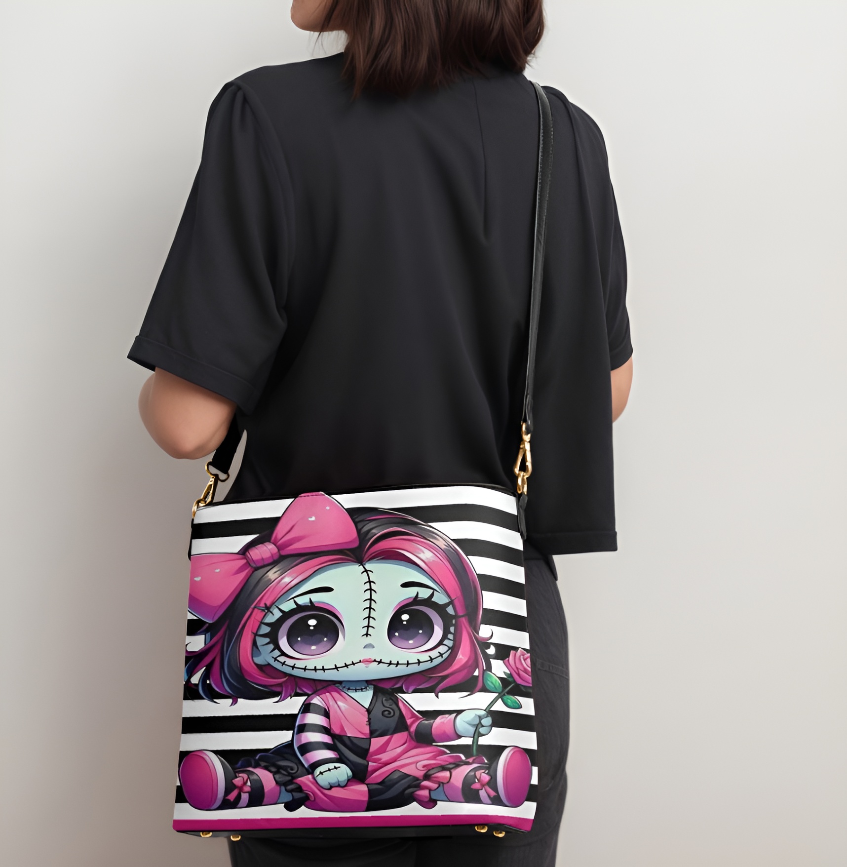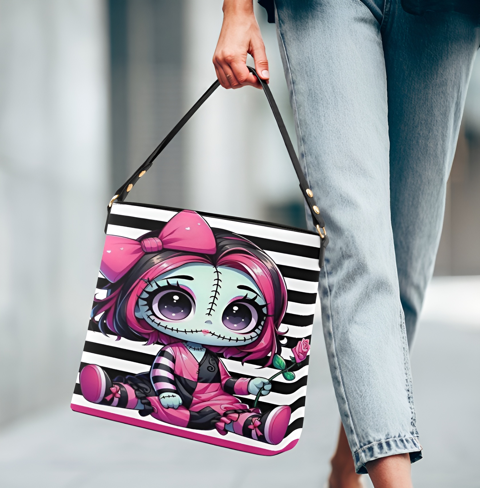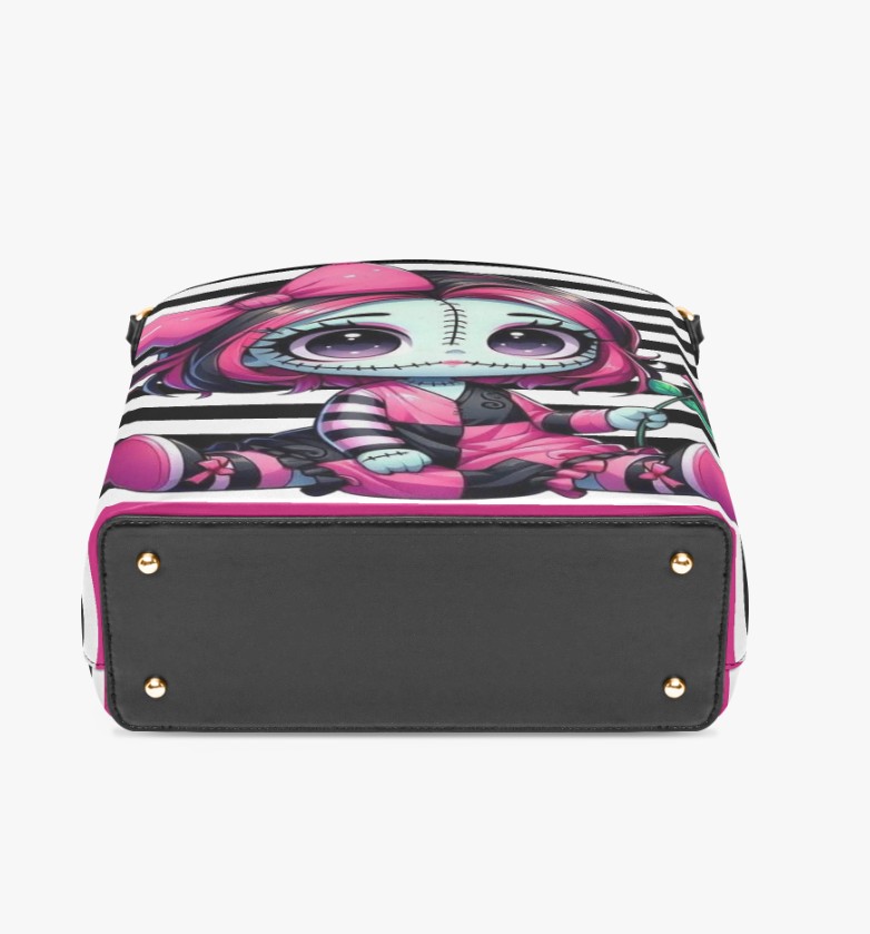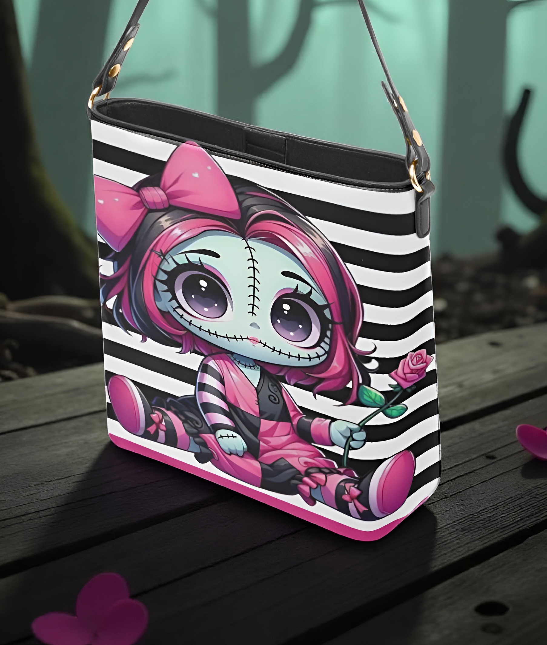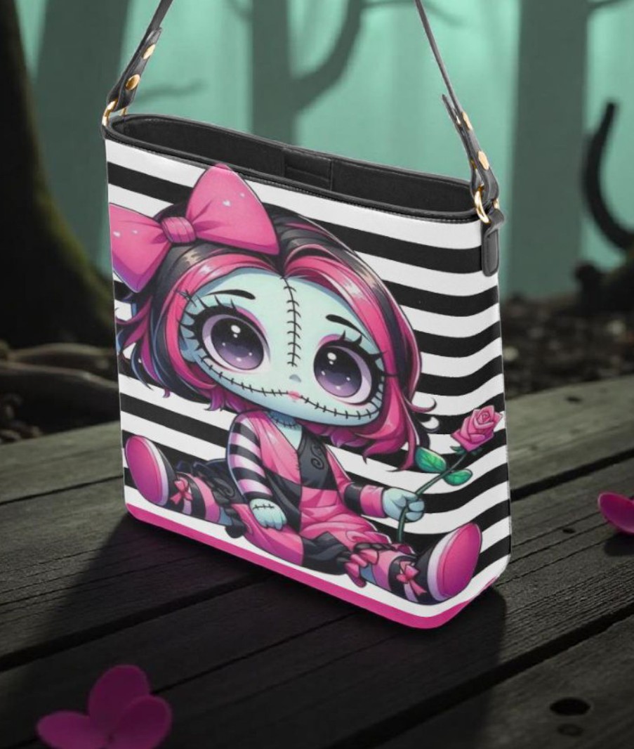 Creepy-cute perfection in bag form! This adorable bucket bag features an irresistibly sweet pastel goth doll with huge sparkling purple eyes, mint green stitched skin, and candy pink hair topped with a matching bow. She sits holding a little rose against bold black and white stripes, dressed in pink and black striped socks that match her playful, slightly spooky vibe. The kawaii aesthetic meets gothic edge in this design that's both precious and delightfully dark. Quality construction includes black leather-look material with gold hardware and an adjustable shoulder strap. Perfect for fans of pastel goth fashion, kawaii collectors, or anyone who loves their cute served with a side of creepy!