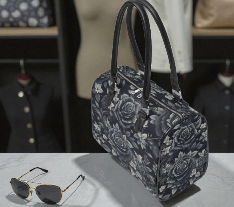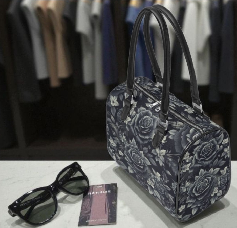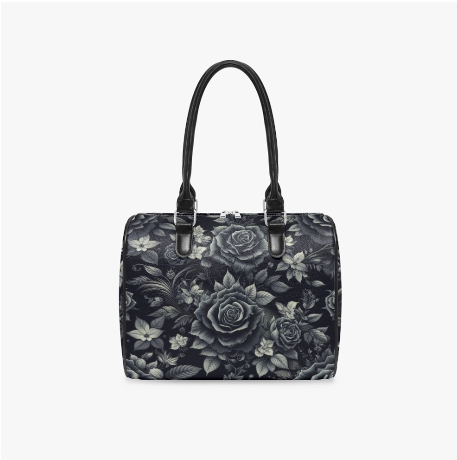 Embrace dark elegance with this stunning gothic black rose leather bag! This sophisticated travel bag features an enchanting all-over print of black and gray roses with delicate leaves on a charcoal background, creating a moody romantic aesthetic. The structured duffle shape with double black leather handles provides both style and functionality. Perfect size for daily use as a spacious handbag. The top zipper closure keeps belongings secure, while the durable vegan leather construction ensures long-lasting quality. The Victorian-inspired floral design makes this bag stand out from ordinary travel bags - it's dark, romantic, and undeniably chic. Whether you're into gothic fashion, love dark florals, or simply appreciate unique statement pieces, this bag delivers sophistication with an edge. Makes an incredible gift for gothic fashion lovers, alternative style enthusiasts, or anyone who appreciates beauty in darkness! 7-12 Day Delivery, Made to Order