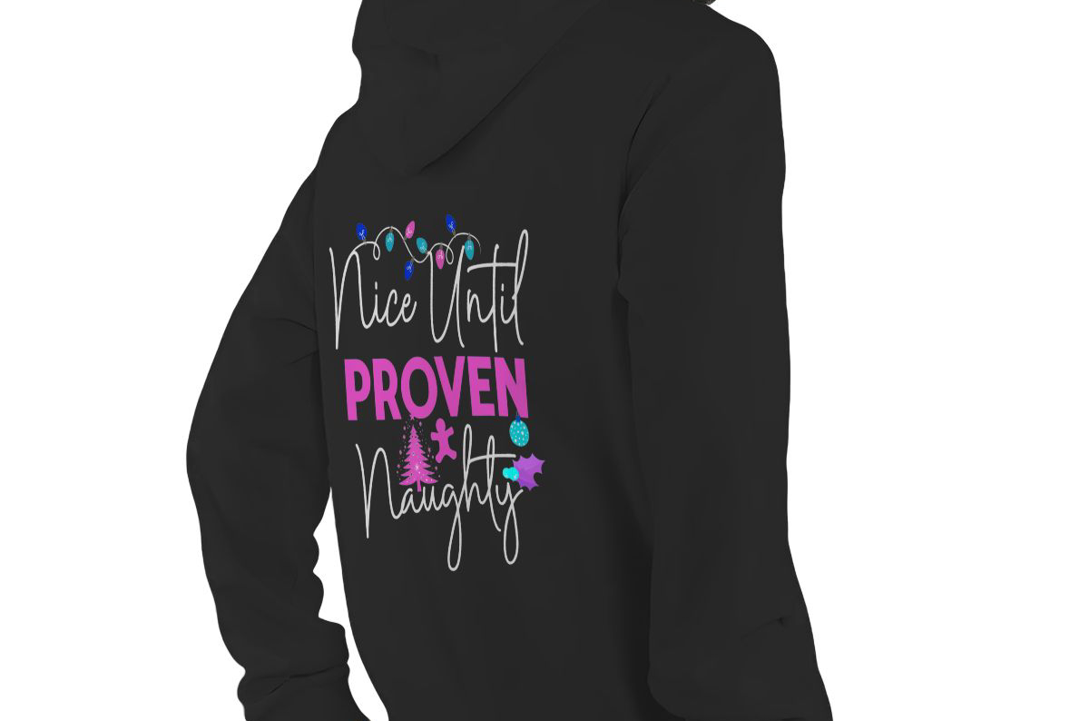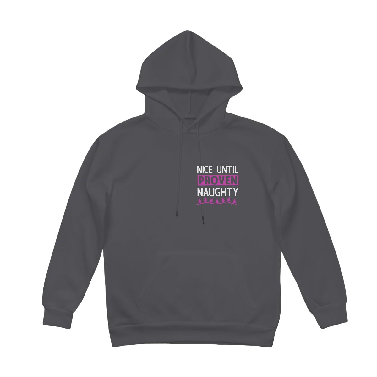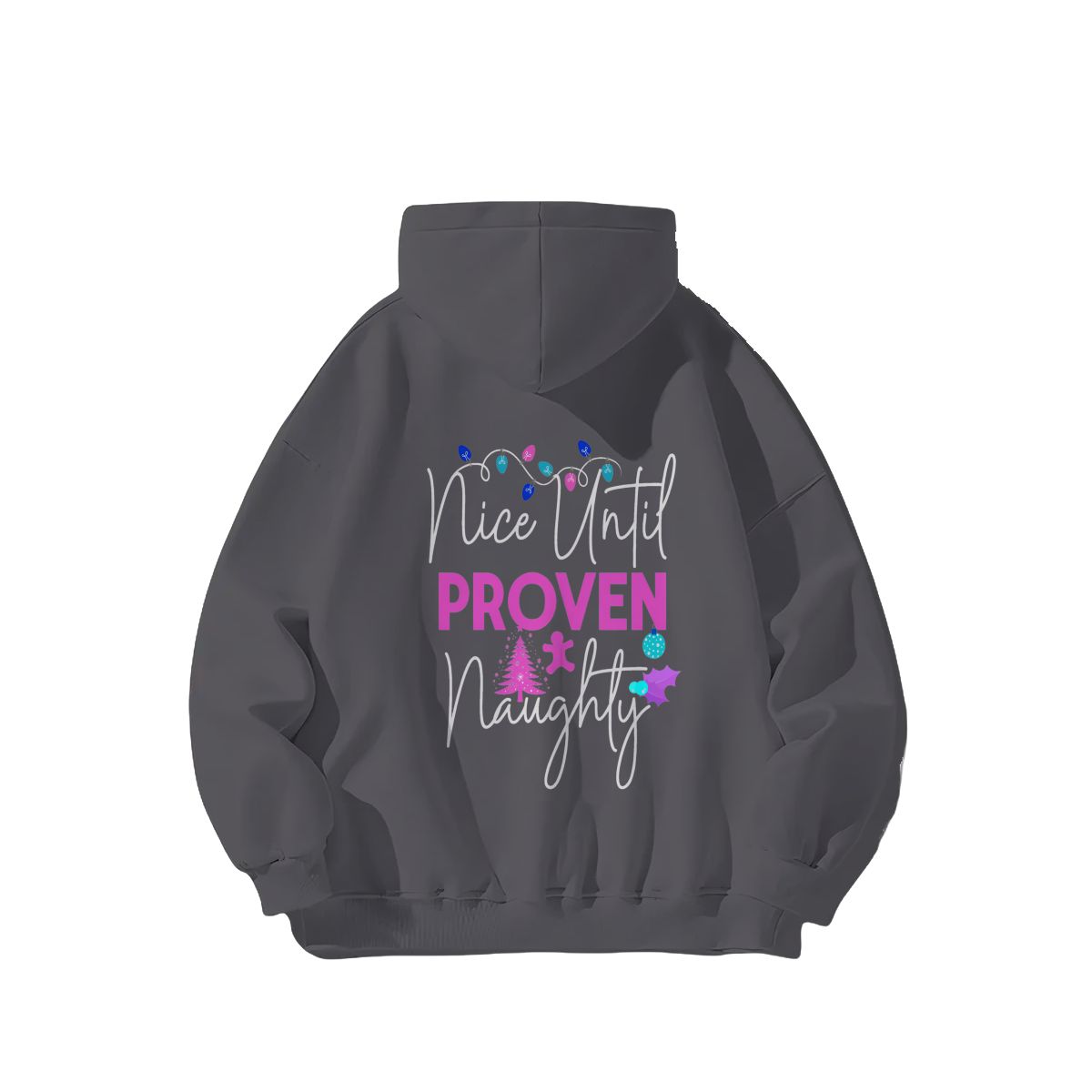 Show off your playful holiday spirit with this "Nice Until Proven Naughty" hoodie! Featuring a fun twist on Santa's naughty or nice list, this cozy hoodie showcases stylish white script lettering with bold pink "PROVEN" text, adorned with colorful Christmas lights, ornaments, snowflakes, and festive stars. The back features a large eye-catching design while the front displays a simple chest design, making it perfect for any holiday occasion. Made from soft, comfortable fabric in classic grey or black, this unisex pullover hoodie is ideal for Christmas parties, holiday gatherings, casual winter wear, or as a statement piece during the festive season. Available in sizes up to XXL for the perfect fit. The cozy hood and kangaroo pocket provide warmth and functionality while the humorous message brings laughter to any celebration. Makes an excellent gift for friends with a sense of humor, family members who love sassy holiday apparel, coworkers, or anyone who walks the line between naughty and nice during the holidays!