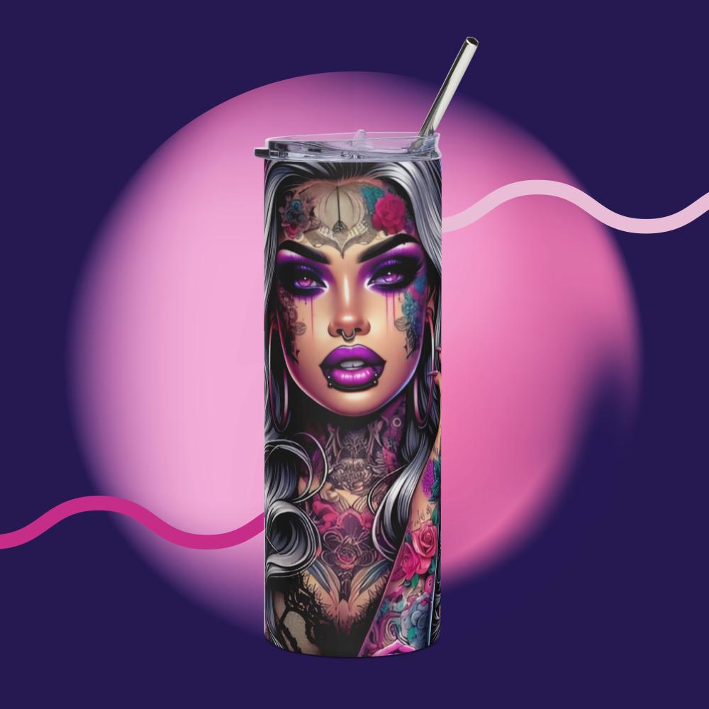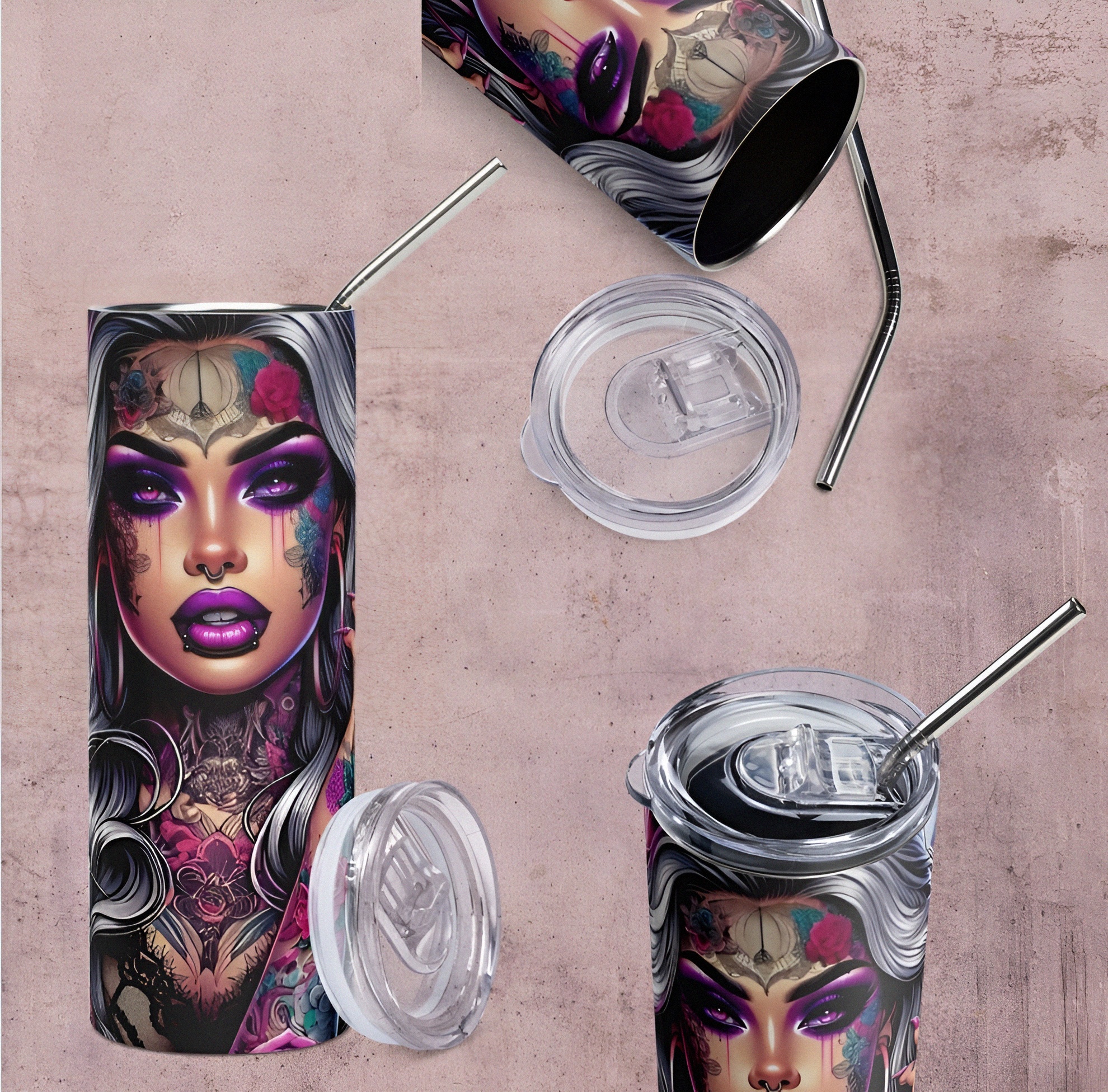 Carry your favorite beverages in style with this eye-catching Gothic Glam stainless steel tumbler featuring a stunning, vibrant art design. Showcasing a detailed portrait of a tattooed woman with dramatic makeup and intricate skull and rose motifs, this tumbler is a true statement piece. Its double-wall insulation keeps your hot drinks steaming and cold drinks chilled for hours. Complete with a secure lid and a reusable metal straw, it's the perfect companion for your daily commute, gym sessions, or just staying hydrated at home