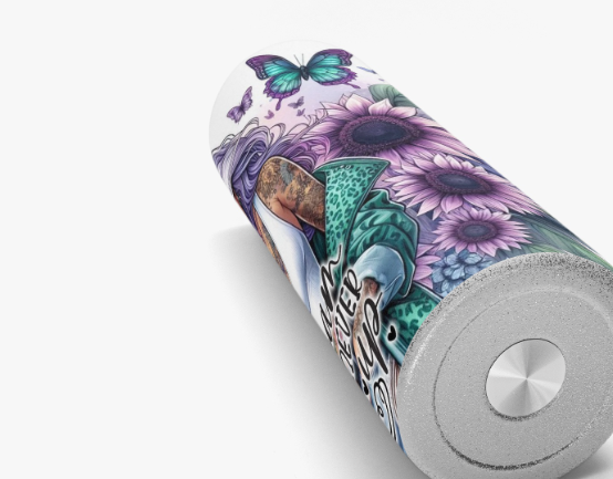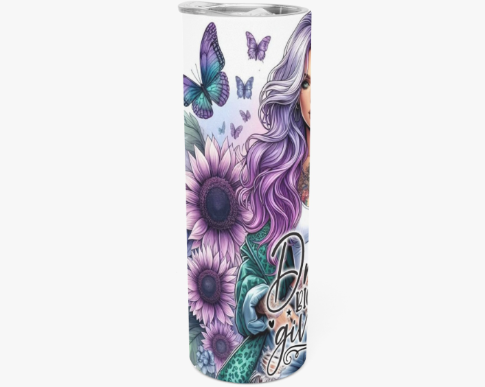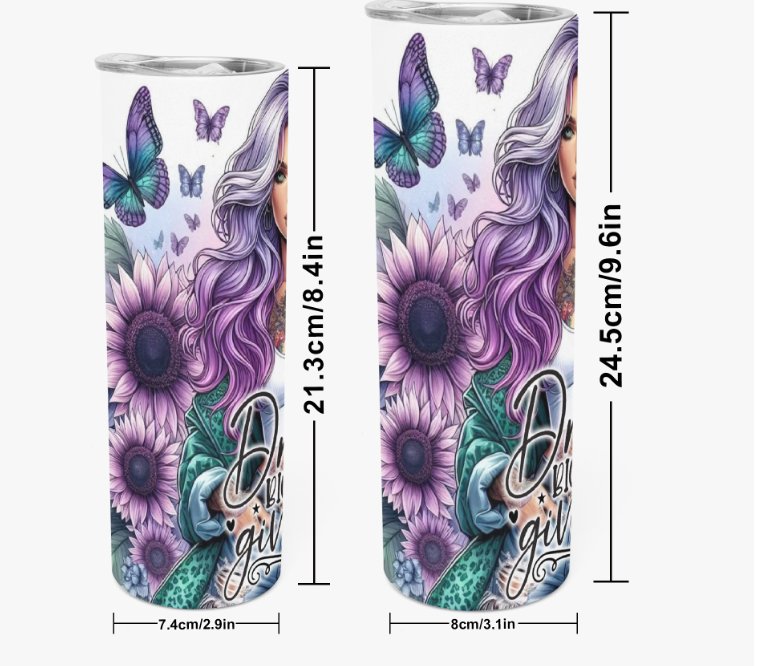 •This eye-catching tumbler features a vibrant design of a beautiful woman with flowing purple and silver hair, intricate tattoos, and a determined gaze. The inspirational message "Dream Big Never Give Up" is elegantly incorporated into the artwork. Delicate purple butterflies flutter around her, adding a touch of whimsy.