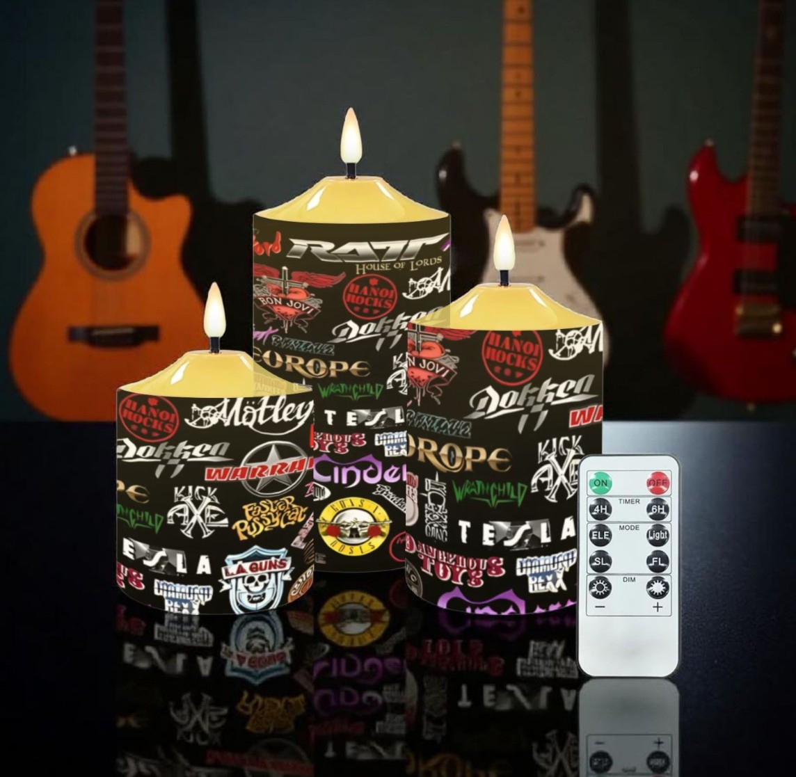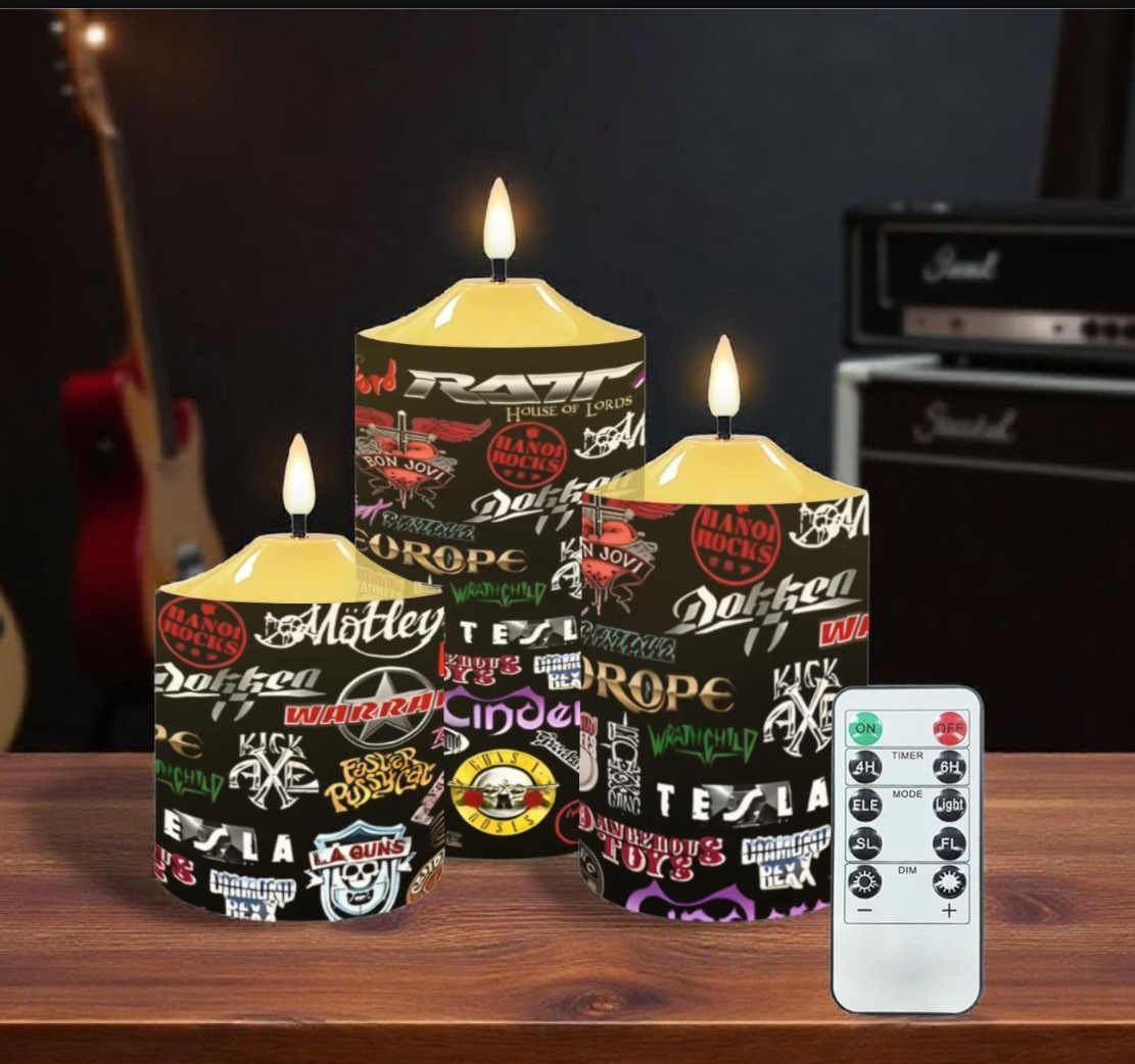 Rock out with candlelight! This badass LED candle set features an explosive collage of iconic heavy metal and rock band logos covering every inch of three different-sized flameless candles. From classic metal legends to hard rock icons, the black background is packed with colorful band artwork, skulls, and that unmistakable rock 'n' roll energy. The flickering LED flames create authentic ambiance without the fire hazard, and the included remote lets you control the mood lighting. Perfect for metalheads who want atmosphere in their man cave, music room, or anywhere that needs some serious rock vibes. Light up your space with the power of metal
