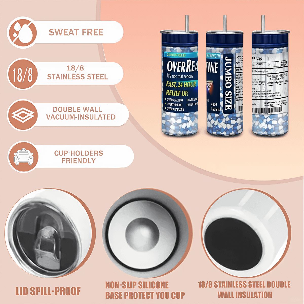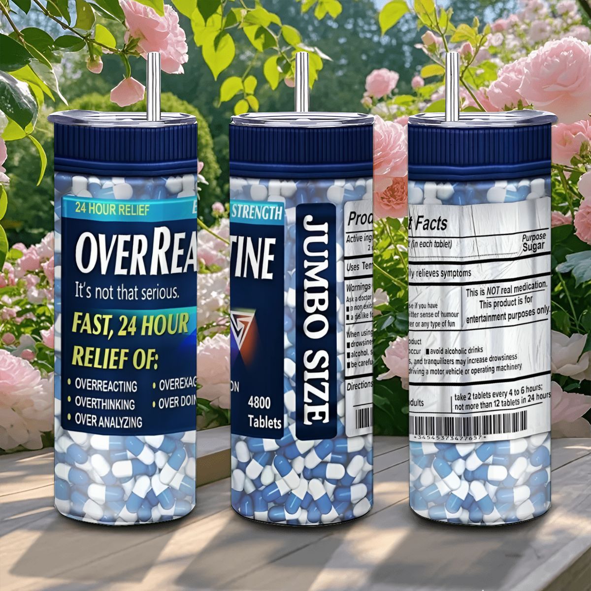The Novelty Med Bottle Prescription Overreactine Humorous Coffee Mug/Tumbler is the perfect gag gift for friends, coworkers, or anyone who needs a laugh. This jumbo-sized design is styled like a med bottle, humorously offering "24 Hour Relief of Overreacting, Overthinking, and Over Analyzing." A fun, unique way to enjoy your coffee or drink!