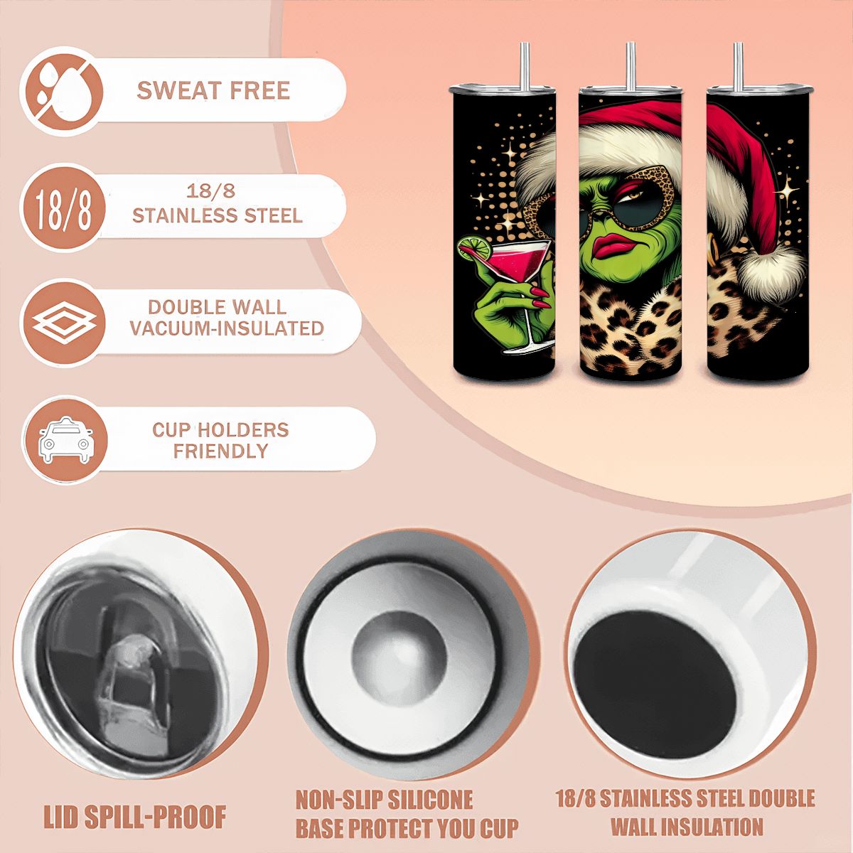 Who says the Grinch can't be glam? This fabulous three-piece tumbler set features a sassy, stylish Grinch ready to steal Christmas in high fashion! Each 20oz skinny tumbler showcases gorgeous artwork with the green mean one wearing a Santa hat, leopard print accents, gold sparkle details, and trendy accessories including sunglasses and a festive martini. Perfect for ladies who love mixing Christmas spirit with attitude and animal print style. These insulated stainless steel tumblers keep drinks hot or cold for hours and include reusable metal straws. Makes an amazing gift for Grinch fans, wine lovers, or anyone who appreciates sassy holiday humor with a glamorous twist!