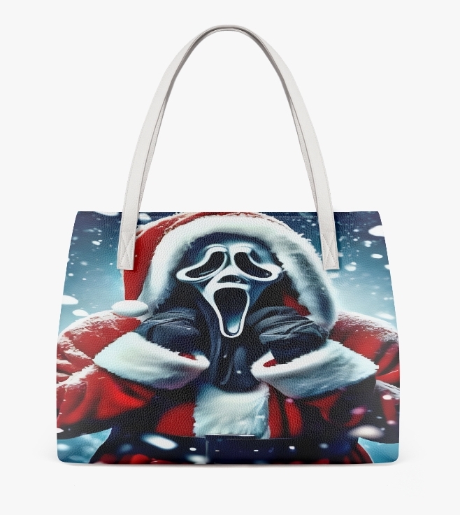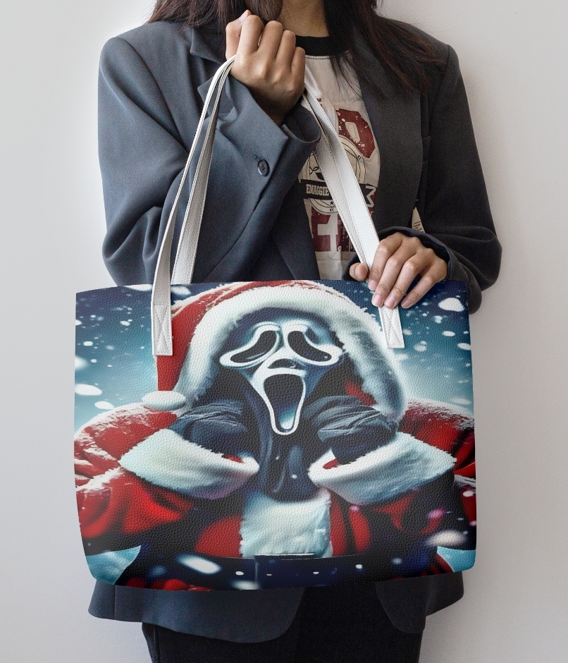 Ghostface Santa, Scream tote bag, horror Christmas, leather tote bag, Santa slasher, Ghostface killer, holiday horror, Christmas tote, Scream franchise, winter horror, festive slasher, Santa Claus bag, horror holiday gift, scary Christmas, white handles tote, spacious tote bag, movie villain, Christmas horror fan, dark Christmas, alternative holiday, gothic Christmas, horror collector, Scream merchandise, Billy Loomis, Stu Macher, Woodsboro, killer Santa, Christmas shopping bag, holiday gift bag, horror aesthetic
