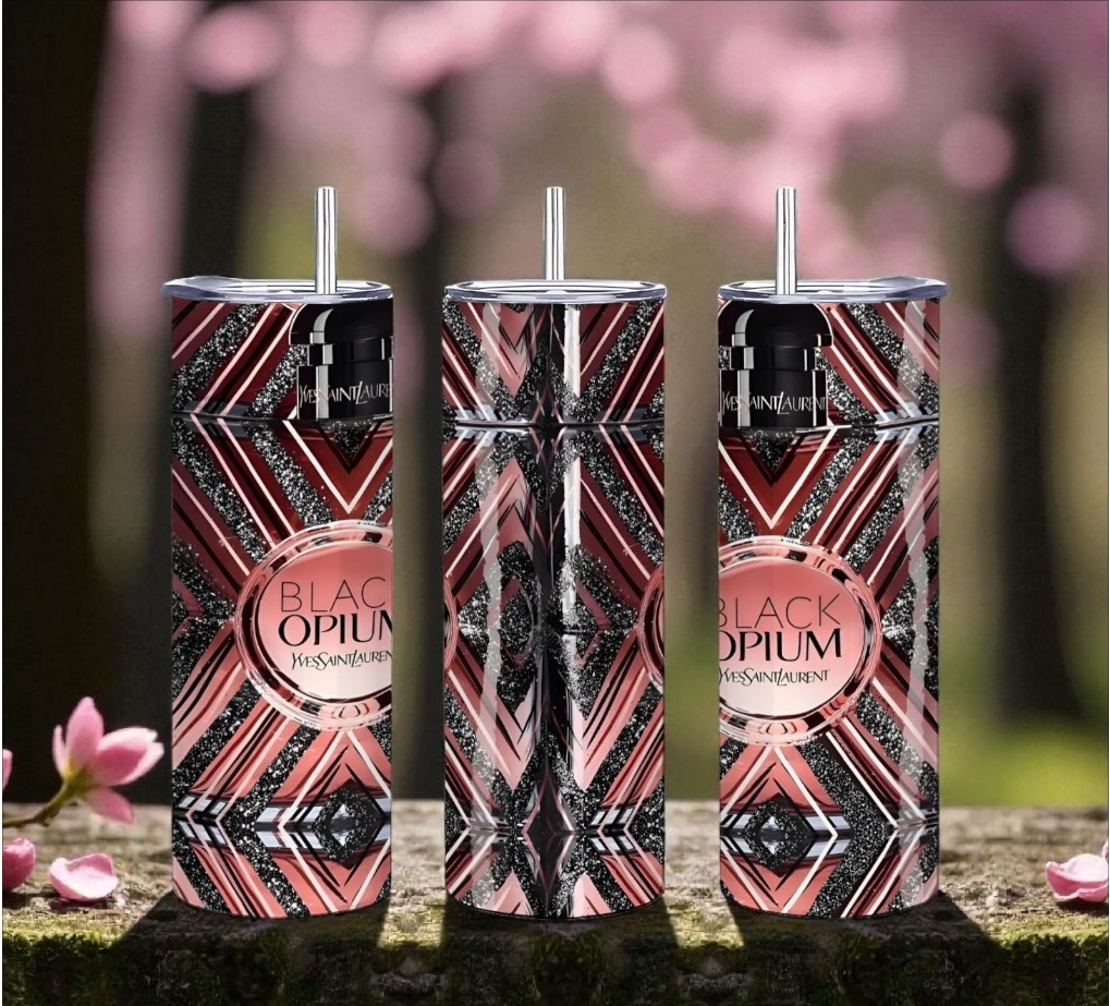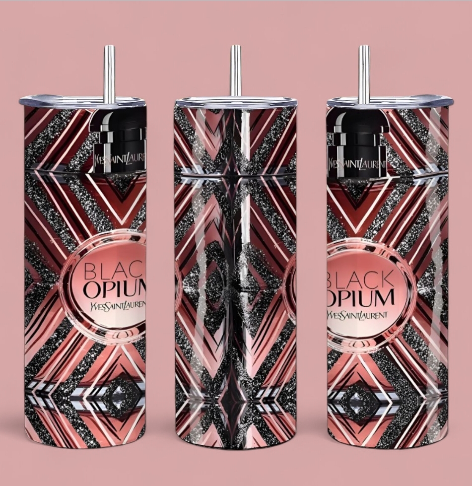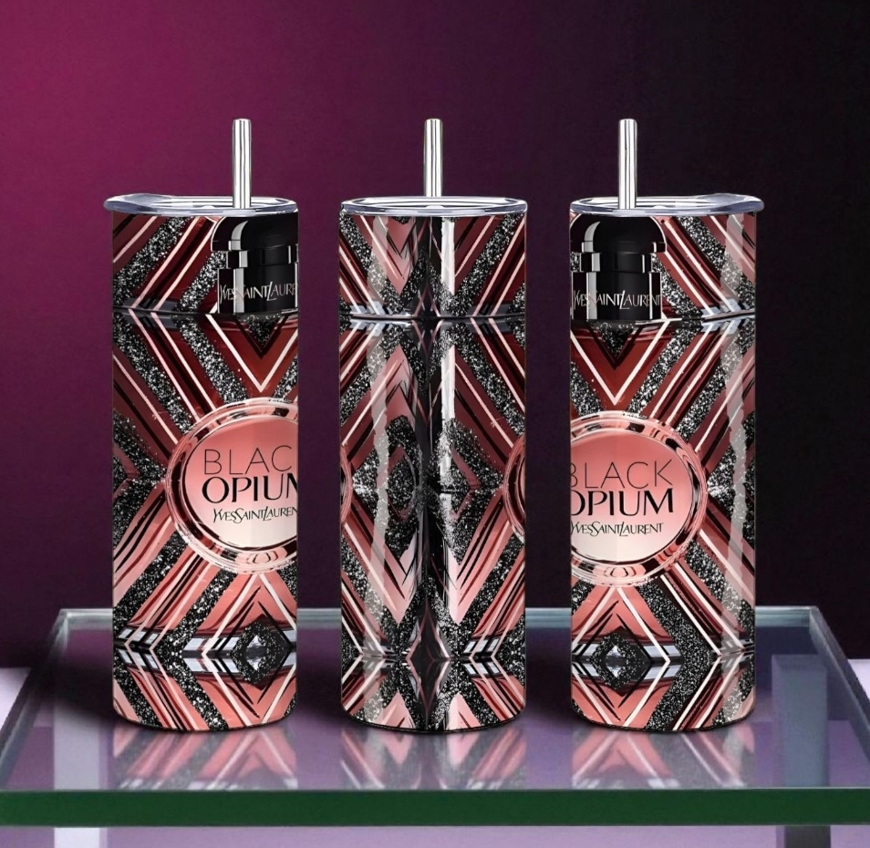Embrace the night with this dazzling "Black Opium" designer-inspired skinny tumbler. Featuring a dramatic, glittery pattern with dark glamour and chic geometric lines, this insulated mug is a perfect blend of high fashion and functionality. It keeps your favorite beverages at the perfect temperature and makes a bold, luxurious statement. This is the ultimate gift for the friend who appreciates luxury fragrance and trend-setting style!