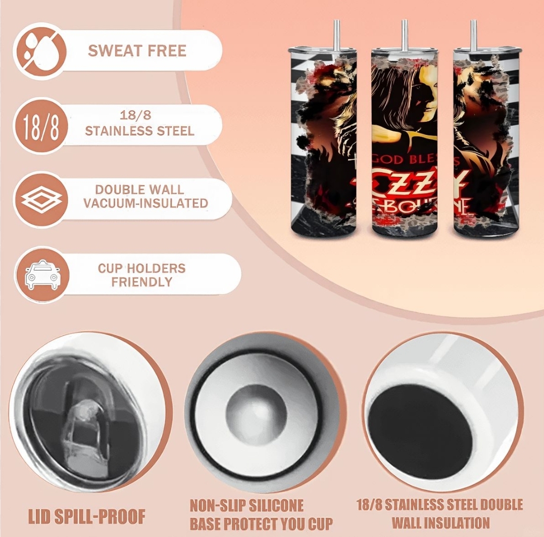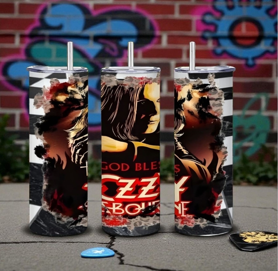 Show your allegiance to the Prince of Darkness with this epic Ozzy Osbourne skinny tumbler! Featuring a stylized portrait of the rock legend and the iconic "God Bless Ozzy Osbourne" text, this insulated travel mug is a must-have for any heavy metal and rock & roll fan. Perfect for concerts, music festivals, or just keeping your beverage cool while you scream at the top of your lungs.