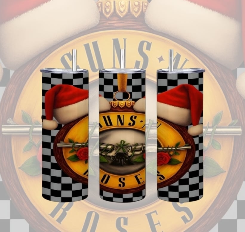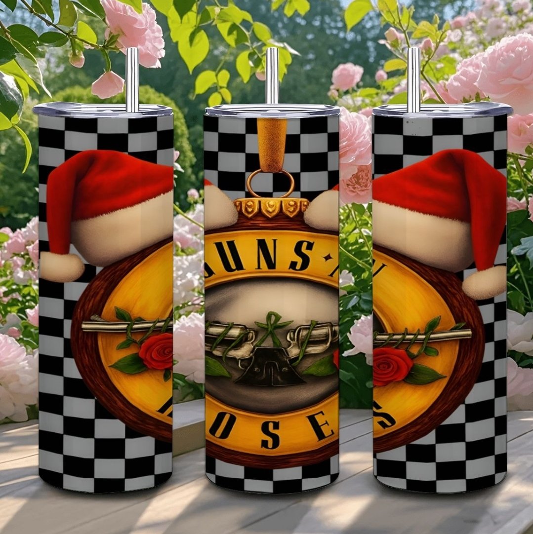 Welcome to the jungle, Christmas style! This awesome GNR skinny tumbler combines the iconic band logo with a festive Santa hat, set against a classic checkered pattern. It's the perfect insulated travel mug for the rock music fan who wants to blend their love for GNR with holiday cheer. Great for Christmas parties, rock festivals, or as a unique stocking stuffer for the Slash or Axl fan in your life.