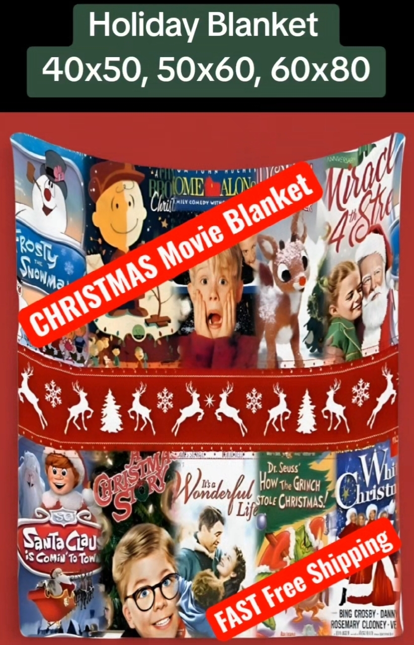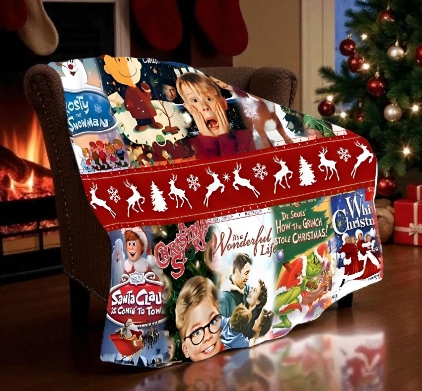 Cuddle up for a cozy movie night with this incredible Christmas Movie Blanket! This plush throw features a collage of beloved holiday film posters, including Home Alone, A Christmas Story, The Grinch, and It's a Wonderful Life. The perfect gift for any film lover or anyone ready for a holiday marathon. With FAST FREE SHIPPING and a soft feel, this blanket guarantees a happy, old-fashioned family Christmas!
