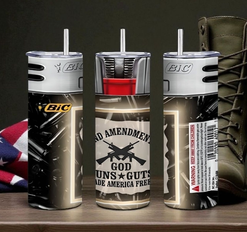 **Stand up for your rights with this powerful 2nd Amendment lighter wrap! Featuring the phrase "God G#ns Guts Made America Free" centered around crossed rifl es and a background of bullet casings. This vinyl decal is designed to fit standard BIC lighters, instantly turning a common lighter into a bold, personalized statement. It's the perfect patriotic gift for g#n enthusiasts, veterans, or anyone who supports the Second Amendment. Lighter is not included. Easy to apply, waterproof, and durable.