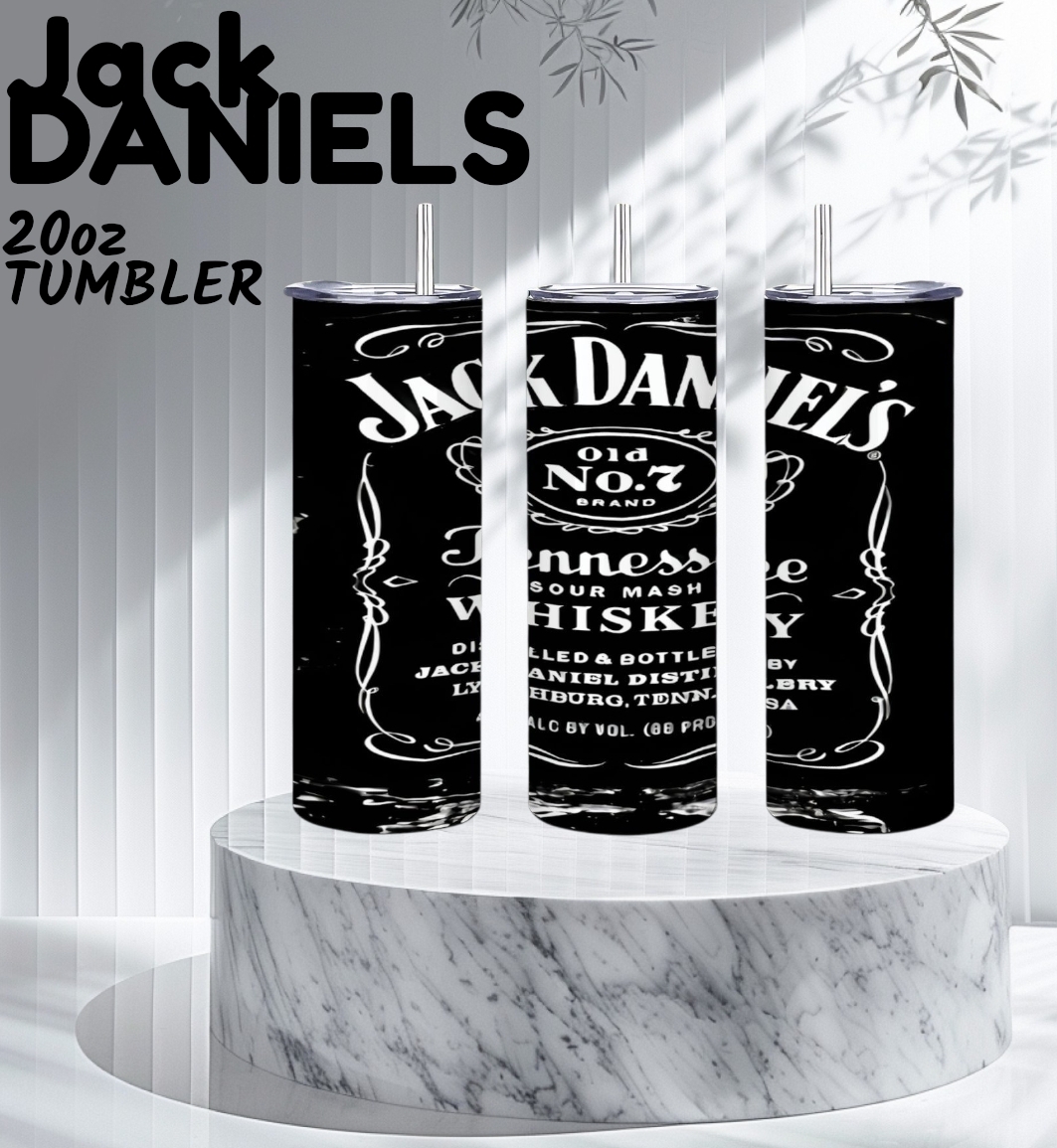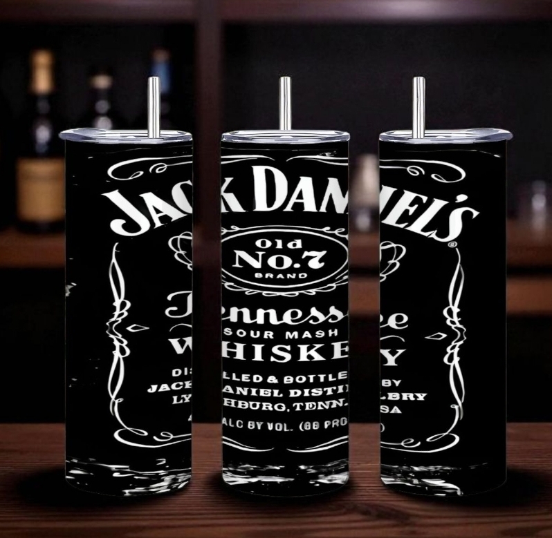 Enjoy your favorite beverage in style with this 20 oz stainless steel skinny tumbler featuring a design inspired by the classic Jack Daniel's Old No. 7 Tennessee Whiskey label. The high-quality sublimation process ensures the black and white design is vibrant and durable.