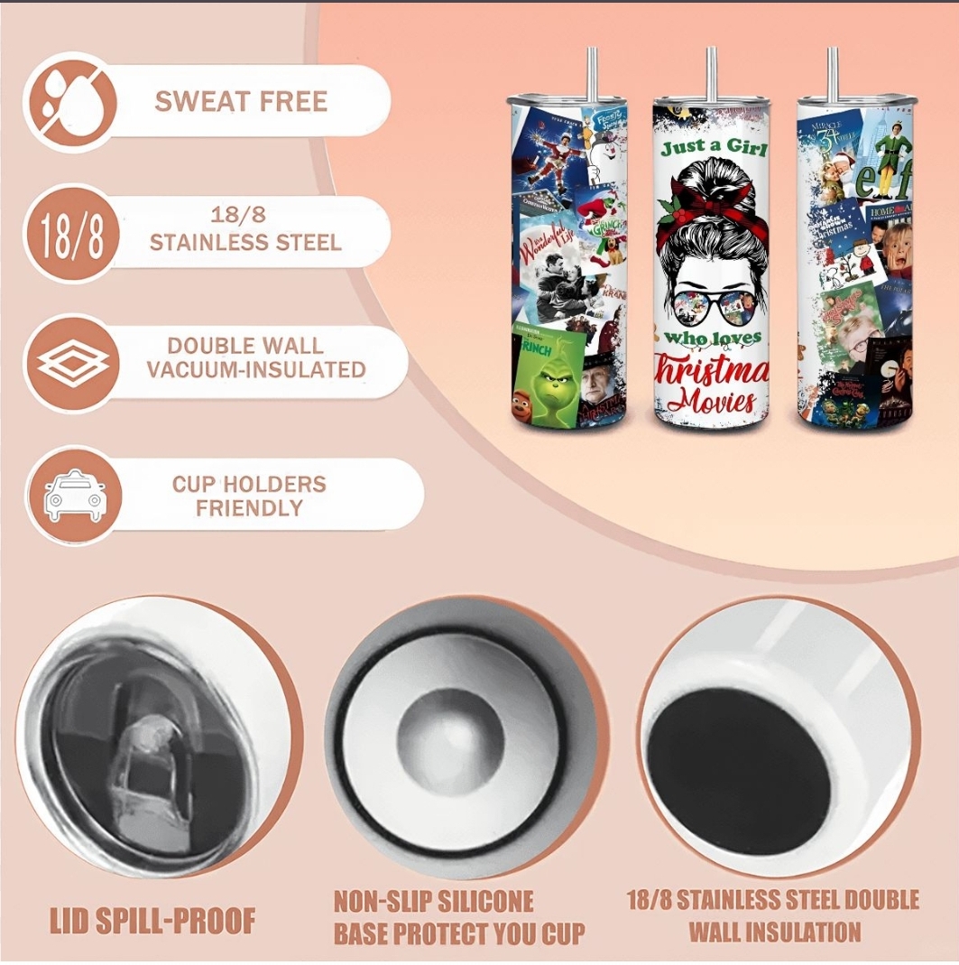 This 20 oz skinny tumbler features a trendy messy bun woman wearing a plaid headband and sunglasses that reflect the magic of the season. The center design is framed by a vibrant, chaotic collage of classic and beloved Christmas movie posters on both sides.