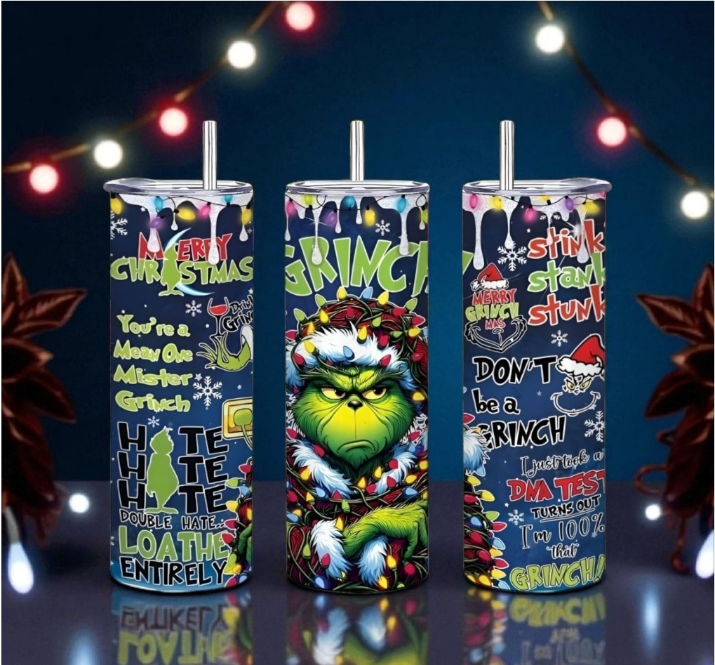 Design: Full wrap sublimation print with The Grinch, Christmas lights, and multiple quotes.