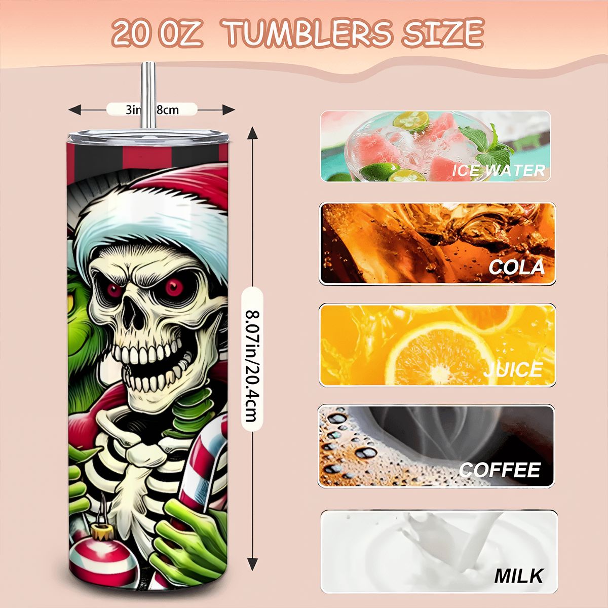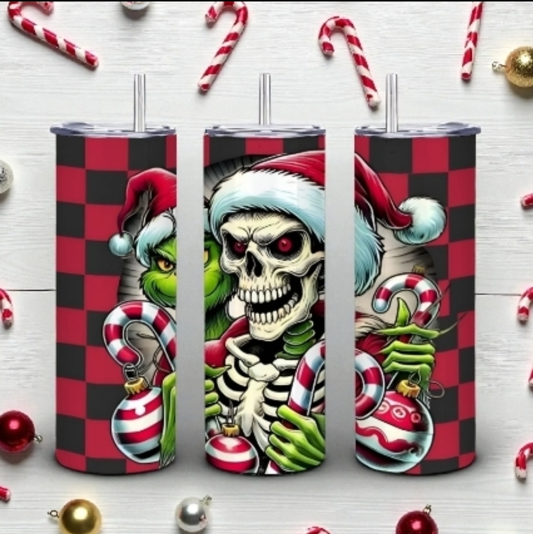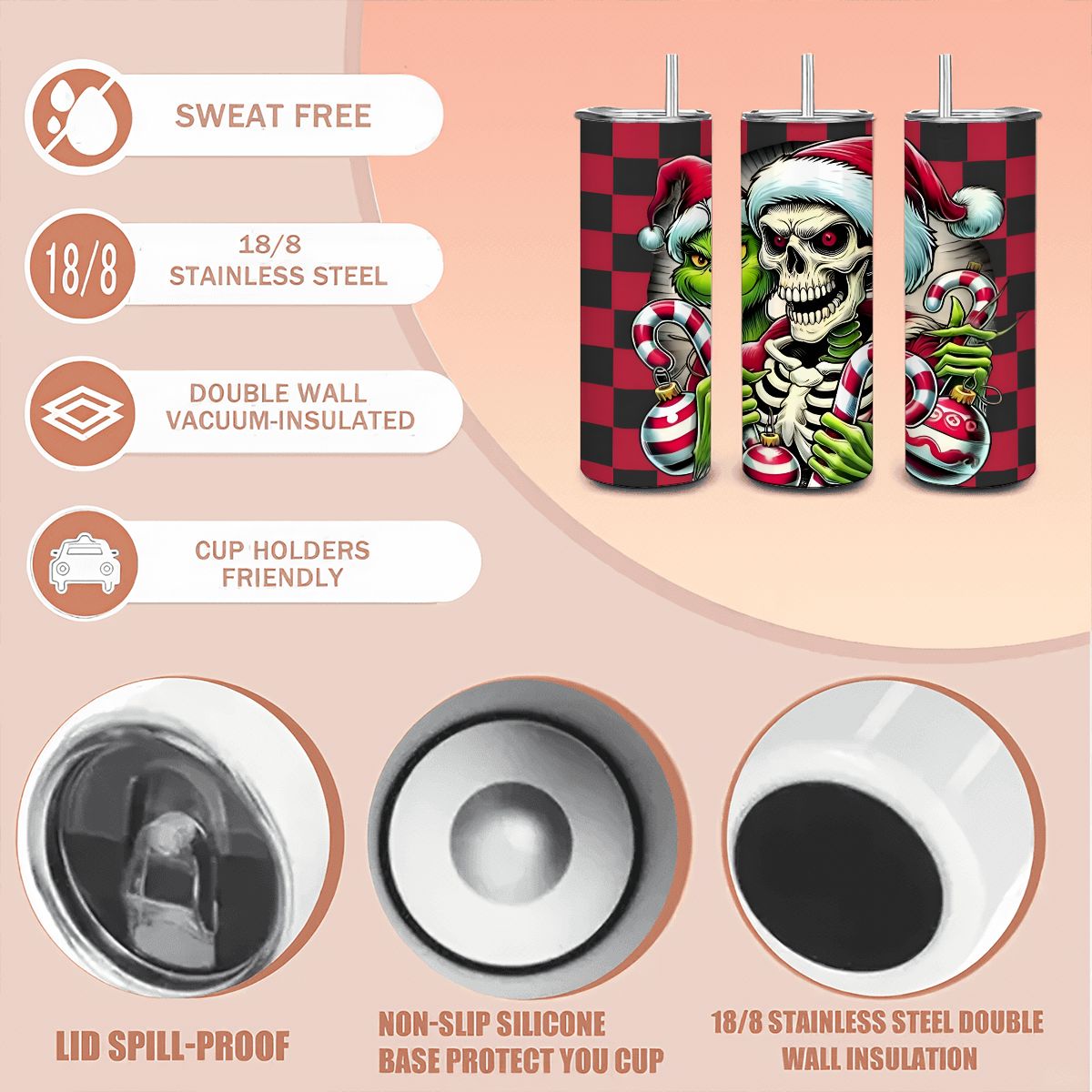 Celebrate Christmas with a dark twist using this epic Grinch skeleton Santa tumbler! This bold 20oz skinny tumbler features a stunning skeleton wearing a Santa hat with Grinch green hands clutching candy canes against a striking red and black buffalo plaid checkered background. The skull has mesmerizing eyes and the Grinch's signature mischievous green fingers wrap around festive peppermint candy canes, creating the perfect blend of spooky, sassy, and festive. Made from premium stainless steel with double-wall insulation to keep drinks hot for 6+ hours or cold for 12+ hours. Includes a reusable metal straw and secure sliding lid. The gothic meets Christmas aesthetic is perfect for alternative holiday lovers, Grinch enthusiasts with an edge, or anyone who likes their Christmas with a side of skull and sass. Whether you're sipping hot cocoa, iced coffee, or holiday cocktails, this tumbler makes a statement. Makes an unforgettable gift for gothic Christmas fans, skeleton collectors, Grinch lovers, or anyone who appreciates dark holiday humor!