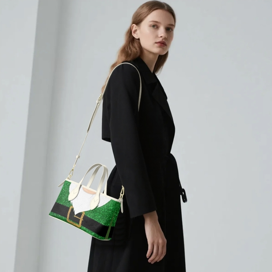 Glitter Green Elf/Grinch Christmas Leather Bag - Holiday Crossover Tote with Faux Beard and Belt