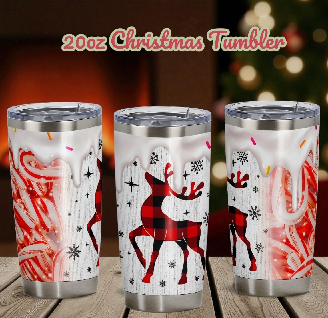 Plaid Reindeer Christmas Drip Tumbler - Candy Cane, Faux Icing & Buffalo Check 20 oz Fat Tumbler DS