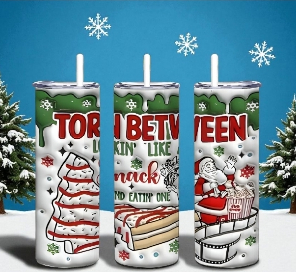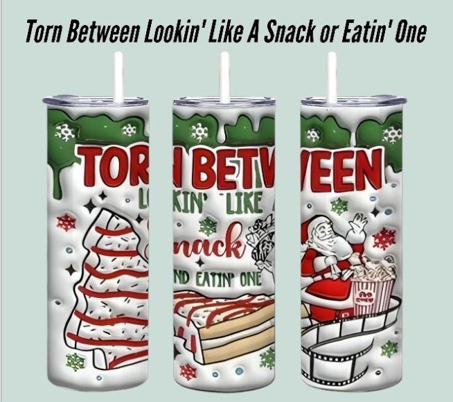 Embrace the holiday snacking struggle with this hilariously relatable "Torn Between Lookin' Like a Snack and Eating One" tumbler! This festive 20oz skinny tumbler features three fun Christmas-themed designs including a candy cane striped Christmas tree with twinkling stars, a delicious bacon and pancake stack, and adorable Santa enjoying popcorn at the movies on a film reel. The white background is accented with green dripping icing effect at the top, red and green snowflakes, sparkles, and festive details that capture the holiday spirit. Bold red lettering makes the funny message pop against the cheerful design. This double-walled insulated tumbler keeps your drinks at the perfect temperature for hours, whether you're indulging in hot cocoa while snacking or staying hydrated during your holiday fitness goals. Complete with a secure lid and reusable straw, it's perfect for daily use, Christmas parties, movie nights, or gifting to friends who understand the eternal holiday diet struggle. Makes an excellent gift for food lovers, fitness enthusiasts with humor, movie buffs, or anyone who loves funny and relatable holiday drinkware!