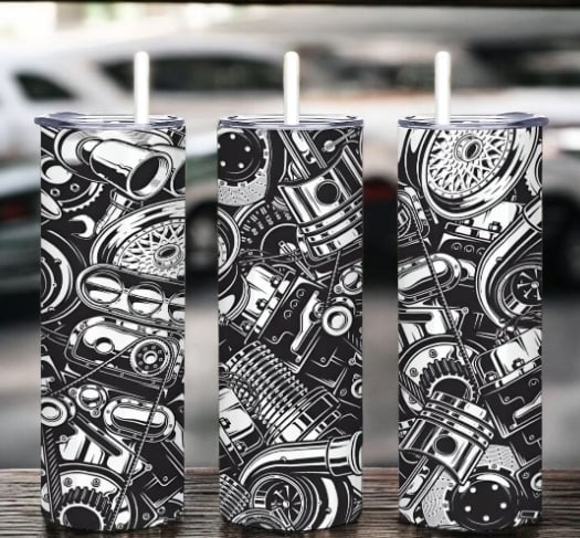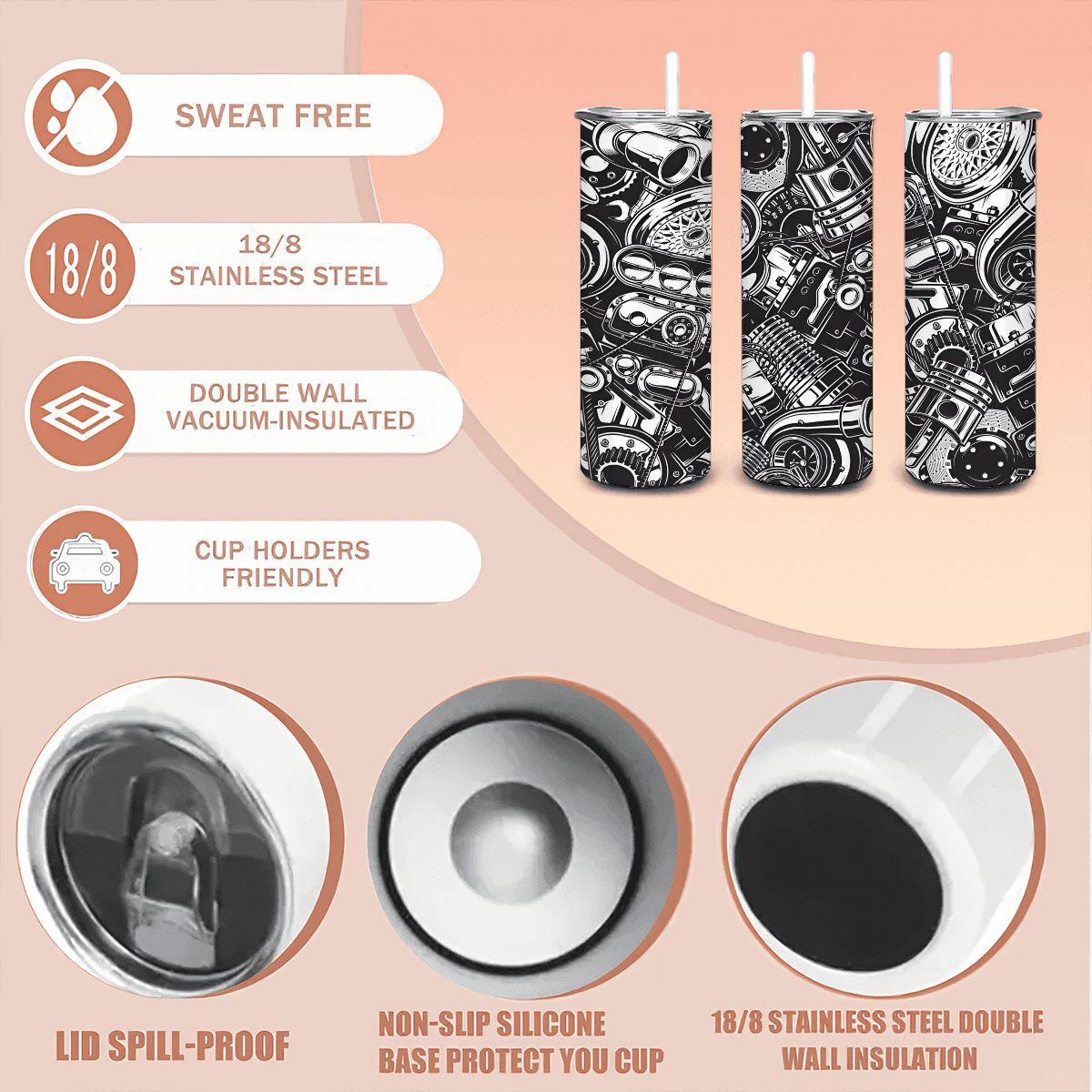 Mechanic Tumbler 20oz Skinny, Engine Parts Blueprint Gift, Black and White Auto Shop