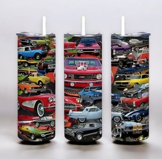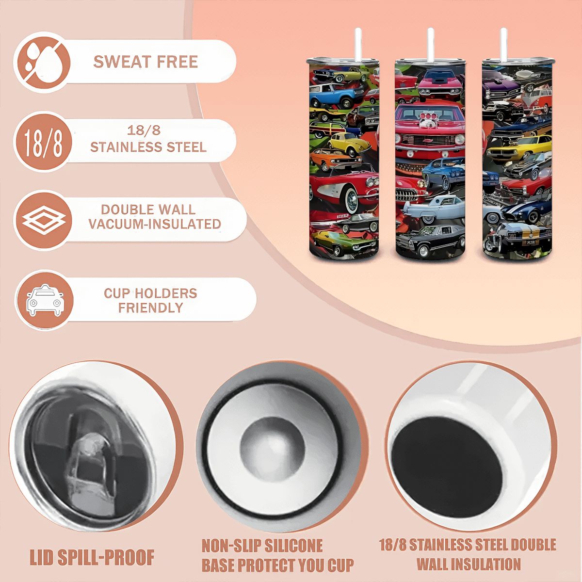 ​HIGH-DETAIL, COLORFUL DESIGN: The full-wrap artwork showcases various eras and styles of classic cars, giving the tumbler a dynamic, high-impact look.