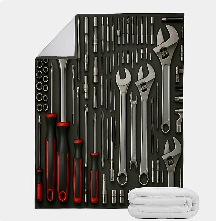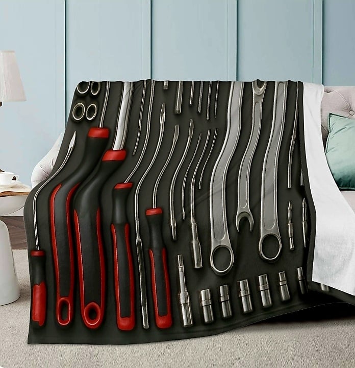 Perfect for the mechanic, DIY enthusiast, or handyman in your life! This unique throw blanket features a highly realistic, detailed print of a full set of tools—including wrenches, sockets, screwdrivers, and pry bars—laid out neatly on a dark, textured background. The realistic design gives a cool, 3D effect, making it an awesome piece of decor for a garage, man cave, or living room. It's not just a cool design, it's also a cozy, super-soft fleece for keeping warm on those chilly evenings after a long day in the shop.