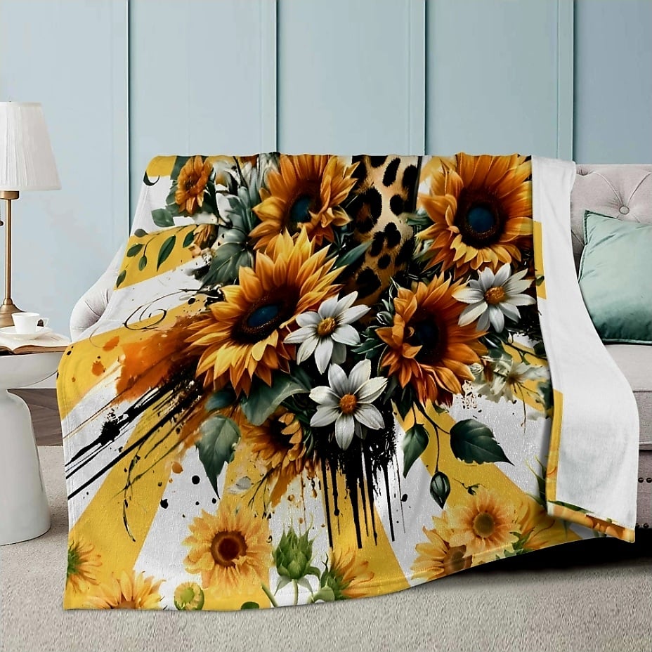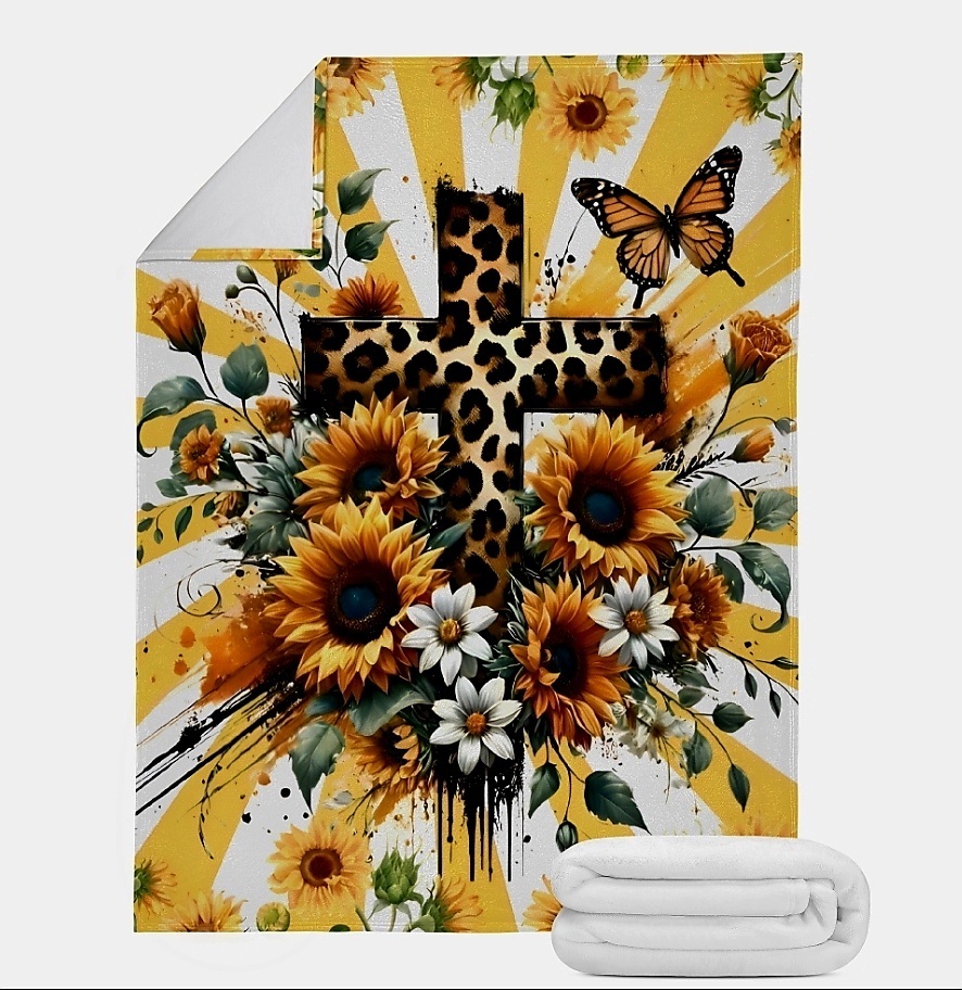 Vibrant Floral Cross Throw Blanket | 60x80 King Throw | Yellow Sunflower and Cheetah Print Faith Decor | Inspirational