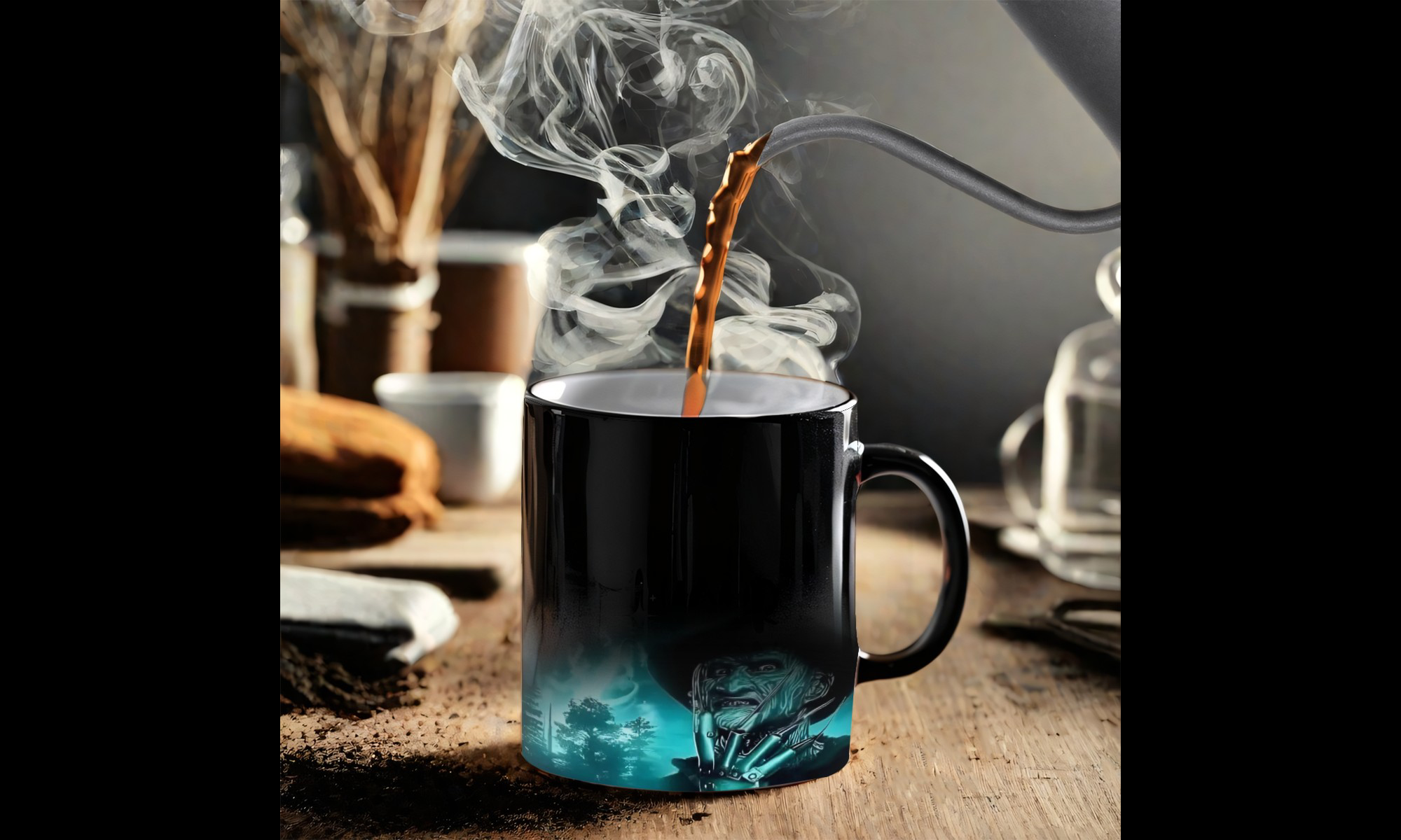 Watch the terror unfold with every pour! This mesmerizing heat-reactive mug starts out mysteriously black when cold, then dramatically reveals iconic horror villains emerging from teal smoke when filled with hot liquid. The color-changing magic transforms your morning coffee routine into a spine-tingling reveal as the hidden images appear before your eyes. Set against a spooky Halloween scene with jack-o'-lanterns and candy corn, this mug combines the fun of heat-sensitive technology with classic horror nostalgia. Perfect for horror fans who love interactive drinkware, collectors of unique mugs, or anyone who wants a little daily magic with their morning scares. It's like a horror movie reveal in every cup!