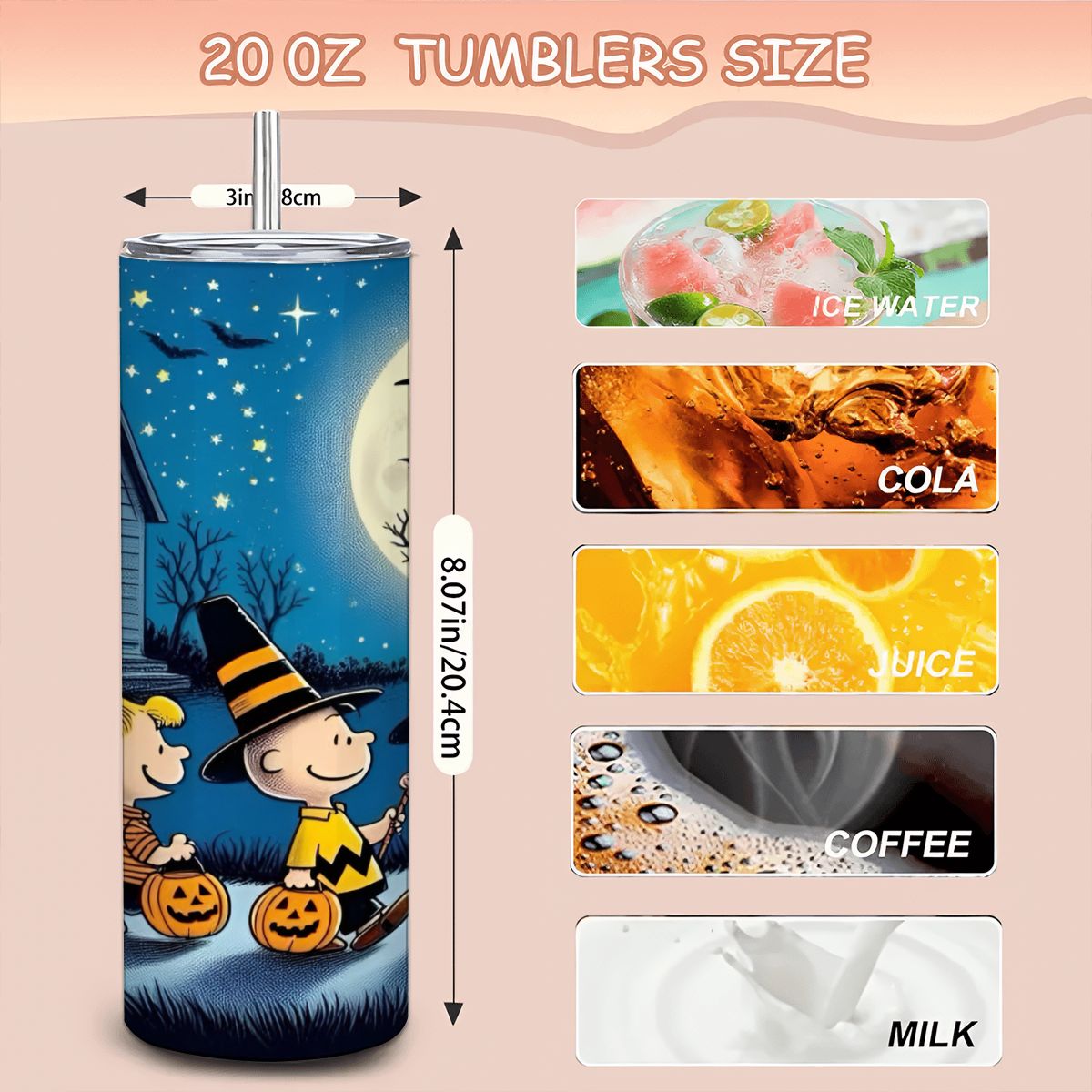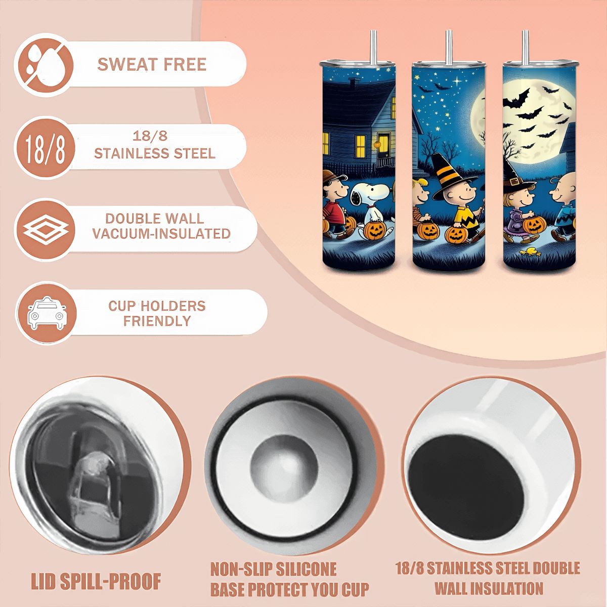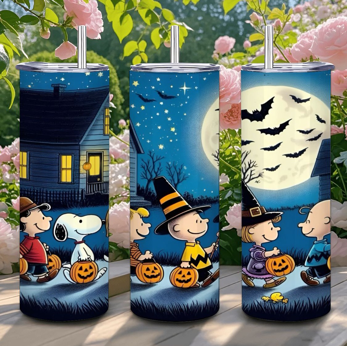 It's the Great Pumpkin night with the whole Peanuts gang! This nostalgic tumbler collection features Charlie Brown, Snoopy, Linus, Sally, and the rest of the beloved characters on a magical Halloween evening. Set against a beautiful moonlit neighborhood with starry skies and flying bats, the classic characters are ready for trick-or-treating with their jack-o'-lanterns and festive costumes. The warm autumn colors and cozy neighborhood setting perfectly capture that special feeling of Halloween night from our childhood. Perfect for Peanuts fans, lovers of classic cartoon nostalgia, or anyone who remembers waiting in the pumpkin patch for the Great Pumpkin. Whether you're sipping hot cider or coffee, this tumbler brings back all the wholesome magic of Halloween with Charlie Brown and friends!