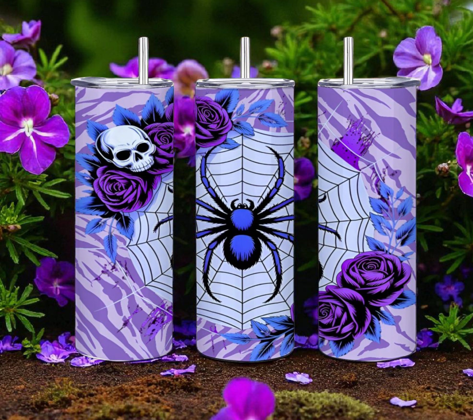 Where darkness meets elegance in the most enchanting way! This captivating tumbler features a striking blue tarantula as the centerpiece of an intricate spider web, beautifully framed by lush purple roses, delicate blue feathers, and a haunting skull. The rich lavender and purple swirling background creates a dreamy yet eerie atmosphere that perfectly balances gothic romance with Halloween spookiness. The sophisticated color palette of deep purples, electric blues, and soft lavenders elevates traditional Halloween imagery into something truly artistic and wearable year-round. Perfect for those who embrace dark aesthetics with elegance, spider lovers who appreciate beauty in the creepy, or anyone seeking a tumbler that's equal parts haunting and haute!