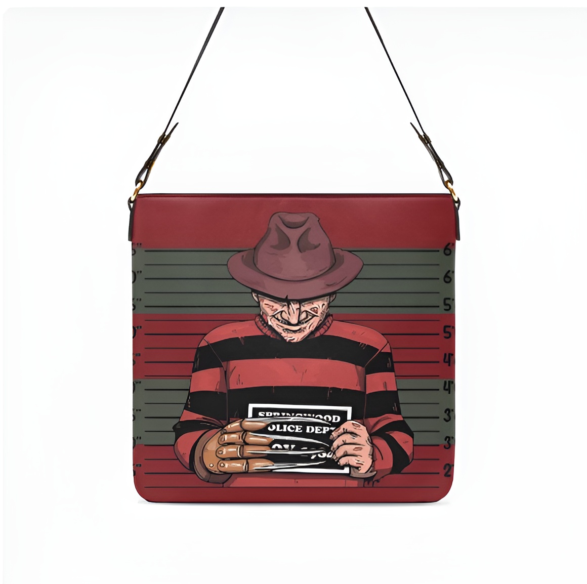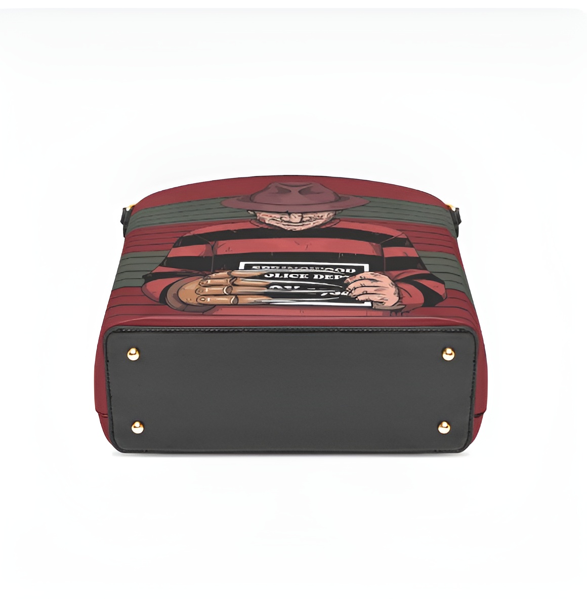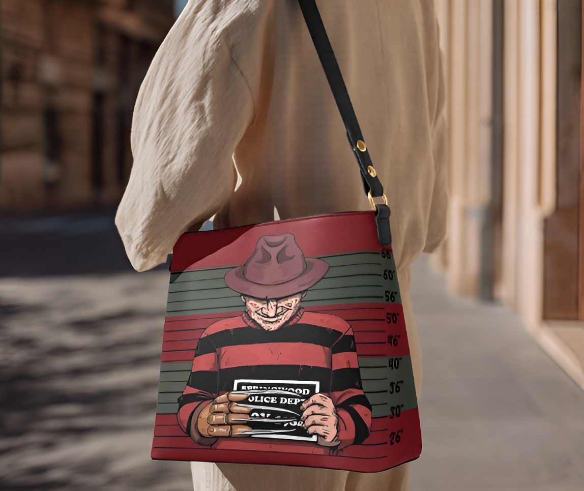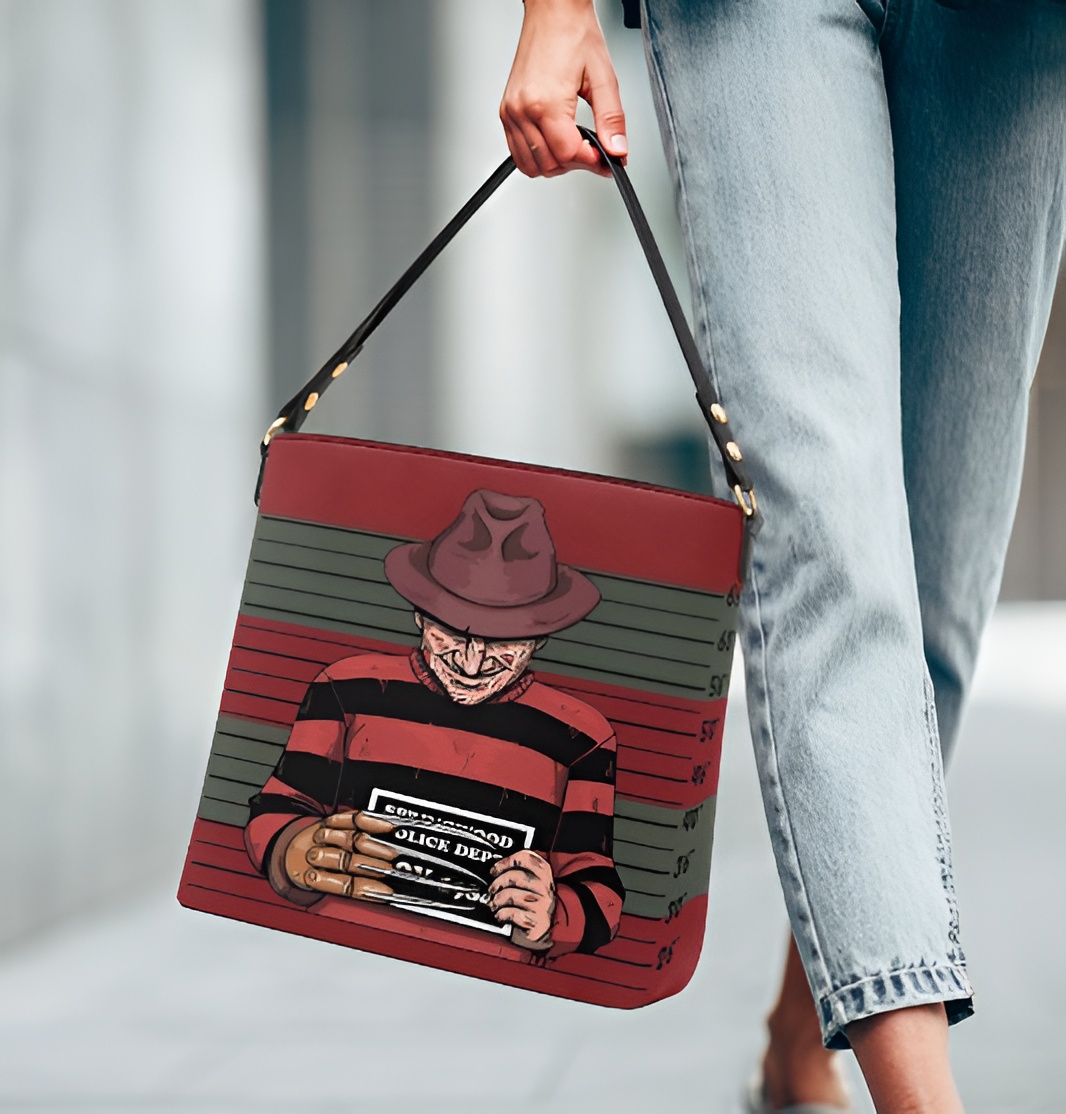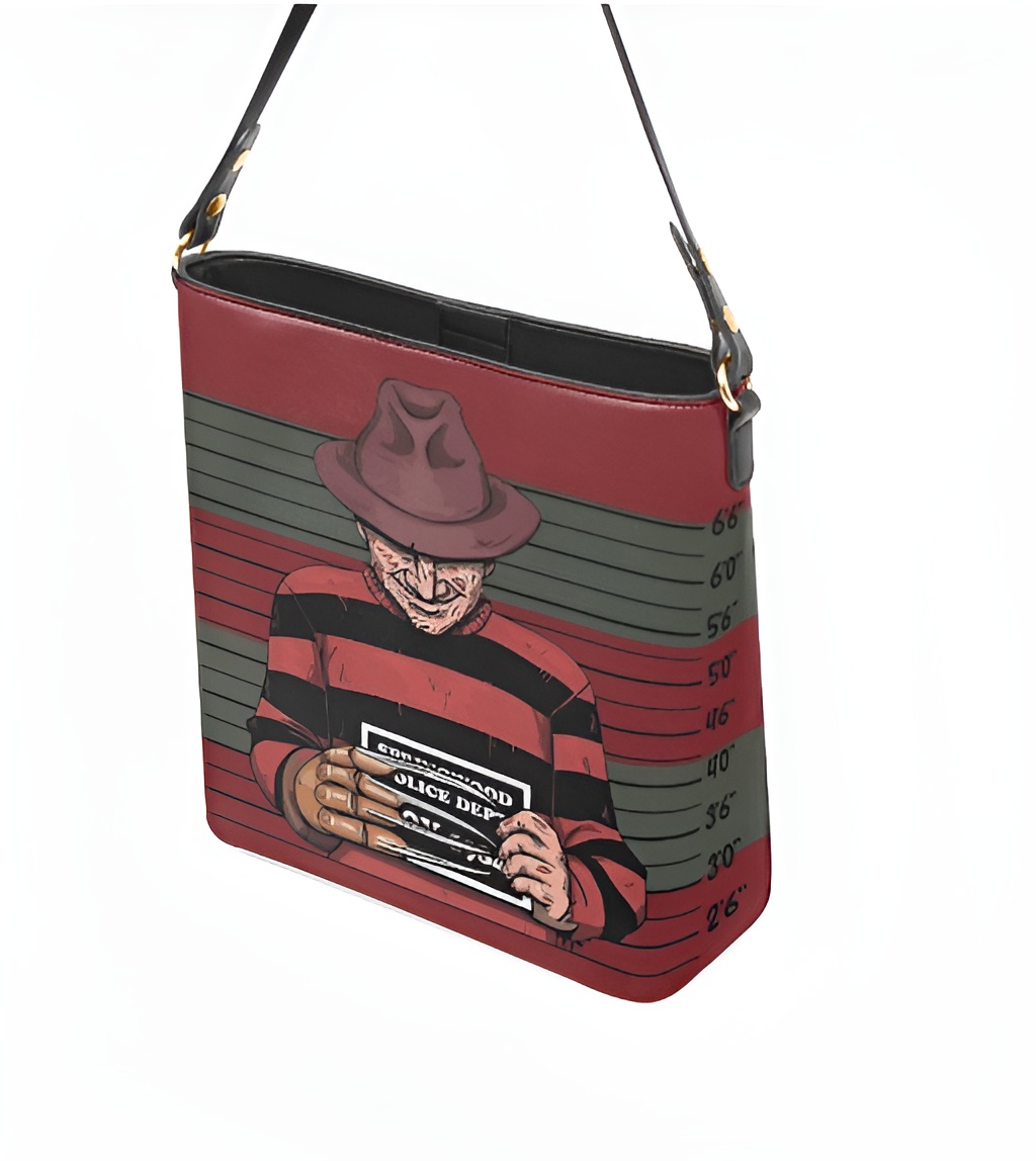 Bring your favorite slasher to life with this horror-inspired leather bucket bag featuring Freddy's iconic mugshot design. Perfect for Halloween enthusiasts and horror movie fans who love carrying their dark side in style.