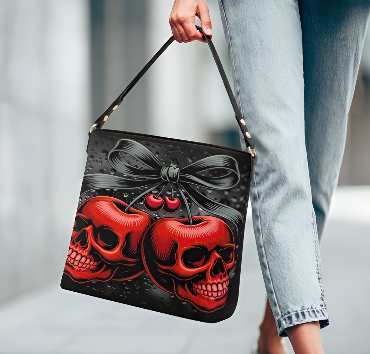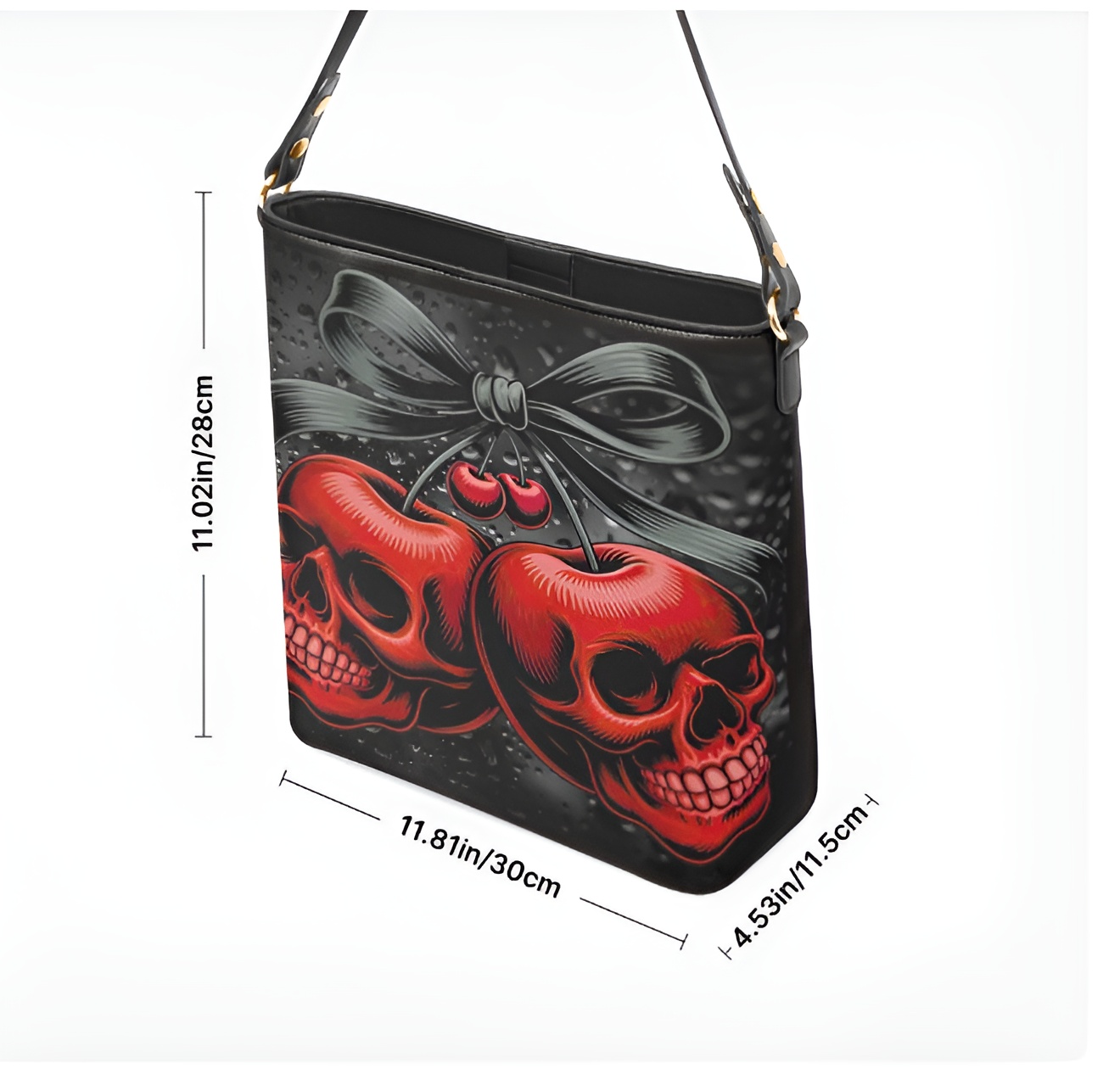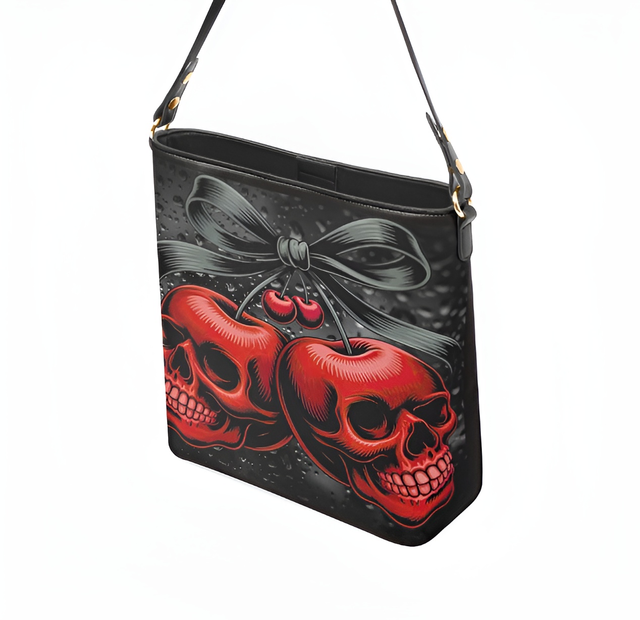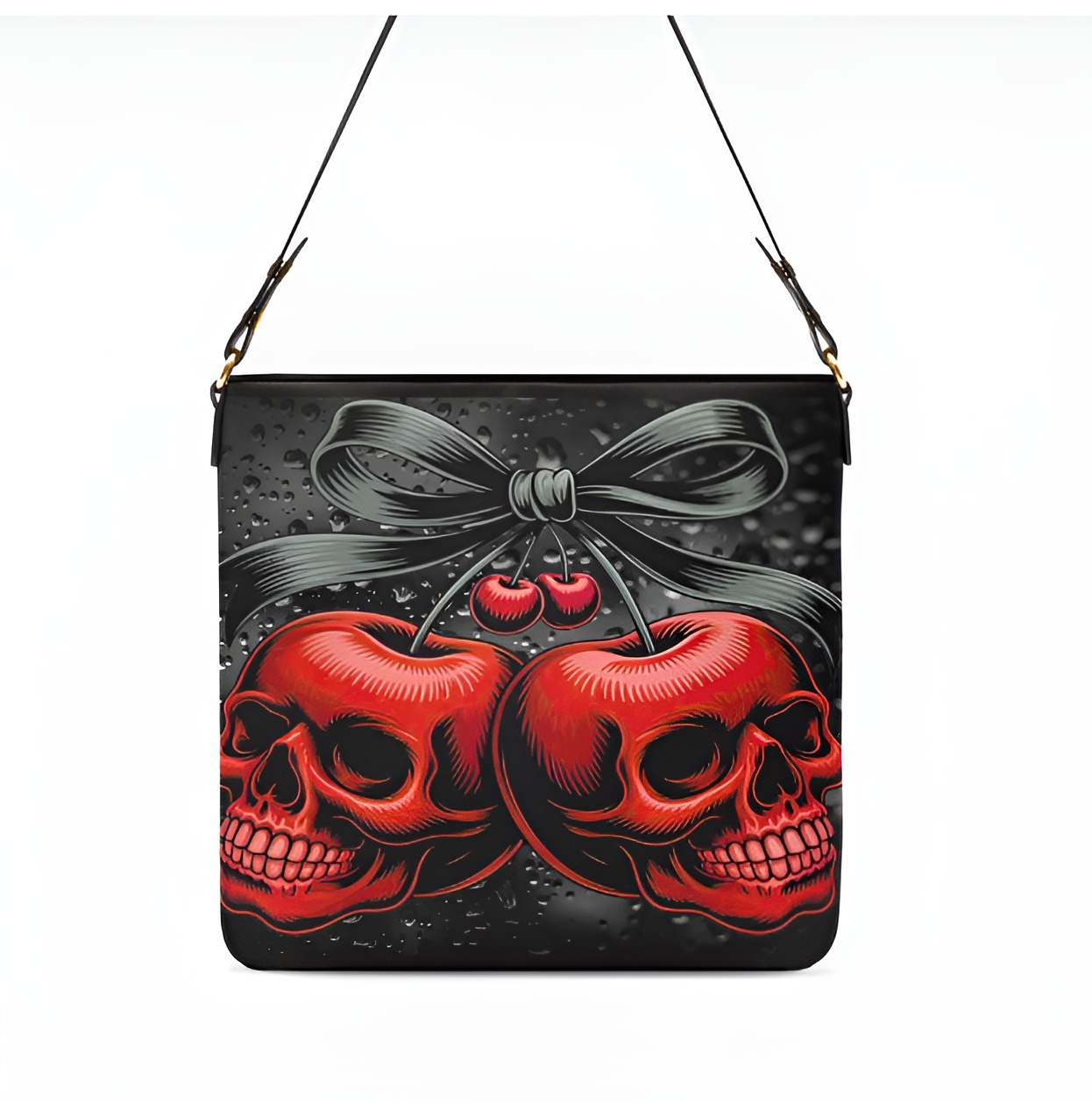 Make a bold, gothic statement with this unique crossbody bag. The design features two strikingly detailed crimson skulls shaped like cherries, complete with a stem and a dramatic gray ribbon tied into a large bow. Set against a dark, rain-drenched background, this bag perfectly blends macabre art with a touch of dark romance. It's the ideal accessory for those with a gothic, rockabilly, or alternative style and is perfect for a night out or adding an edgy touch to your everyday look.