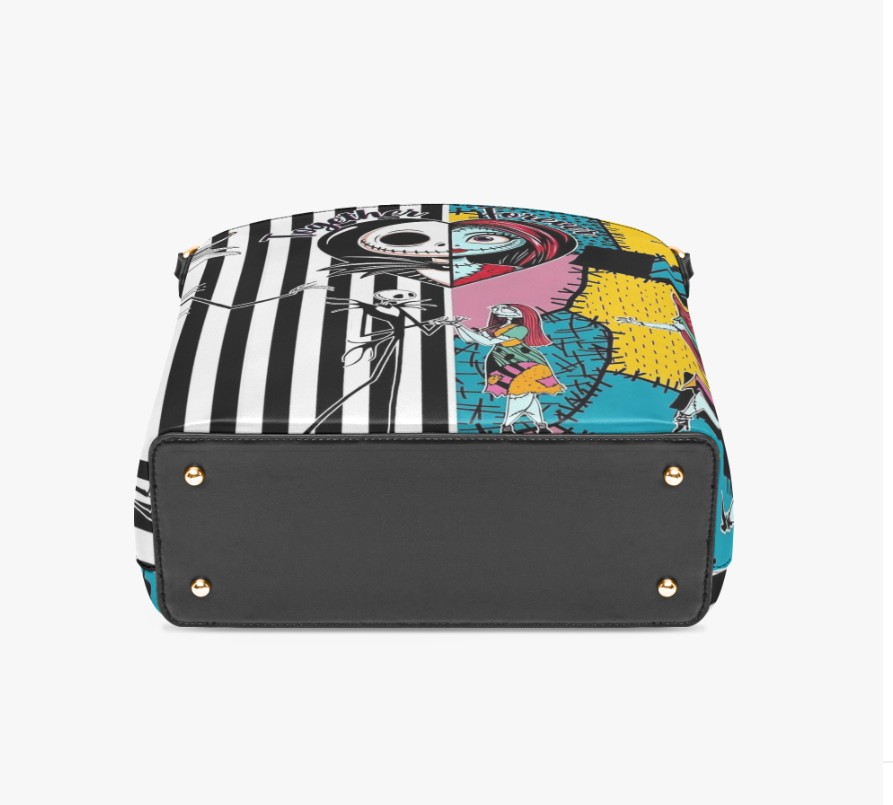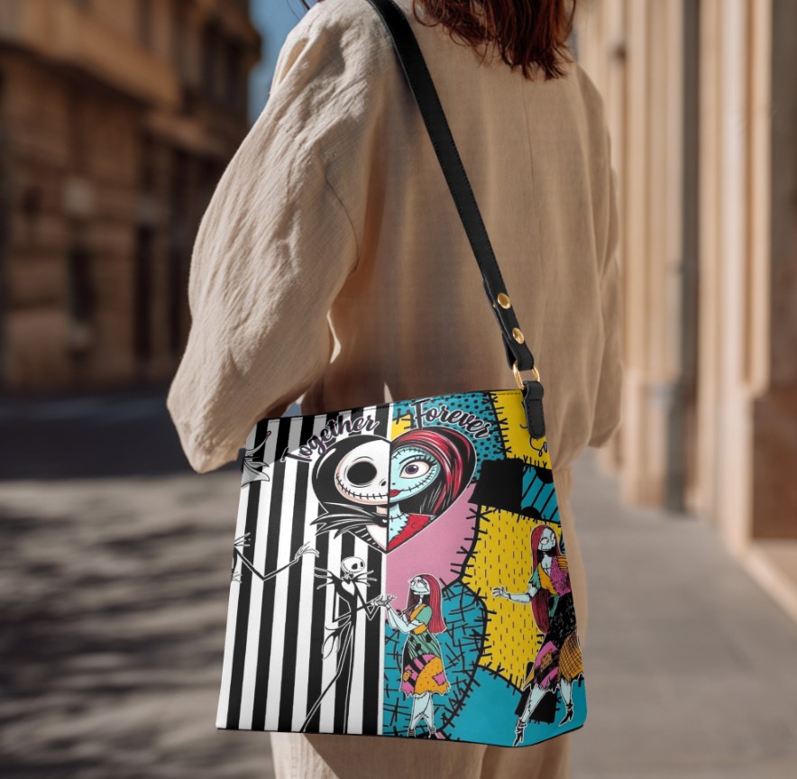 Nightmare Before Christmas Jack & Sally Pop Art Patchwork Leather Bucket Bag | Free Ship JTPRT