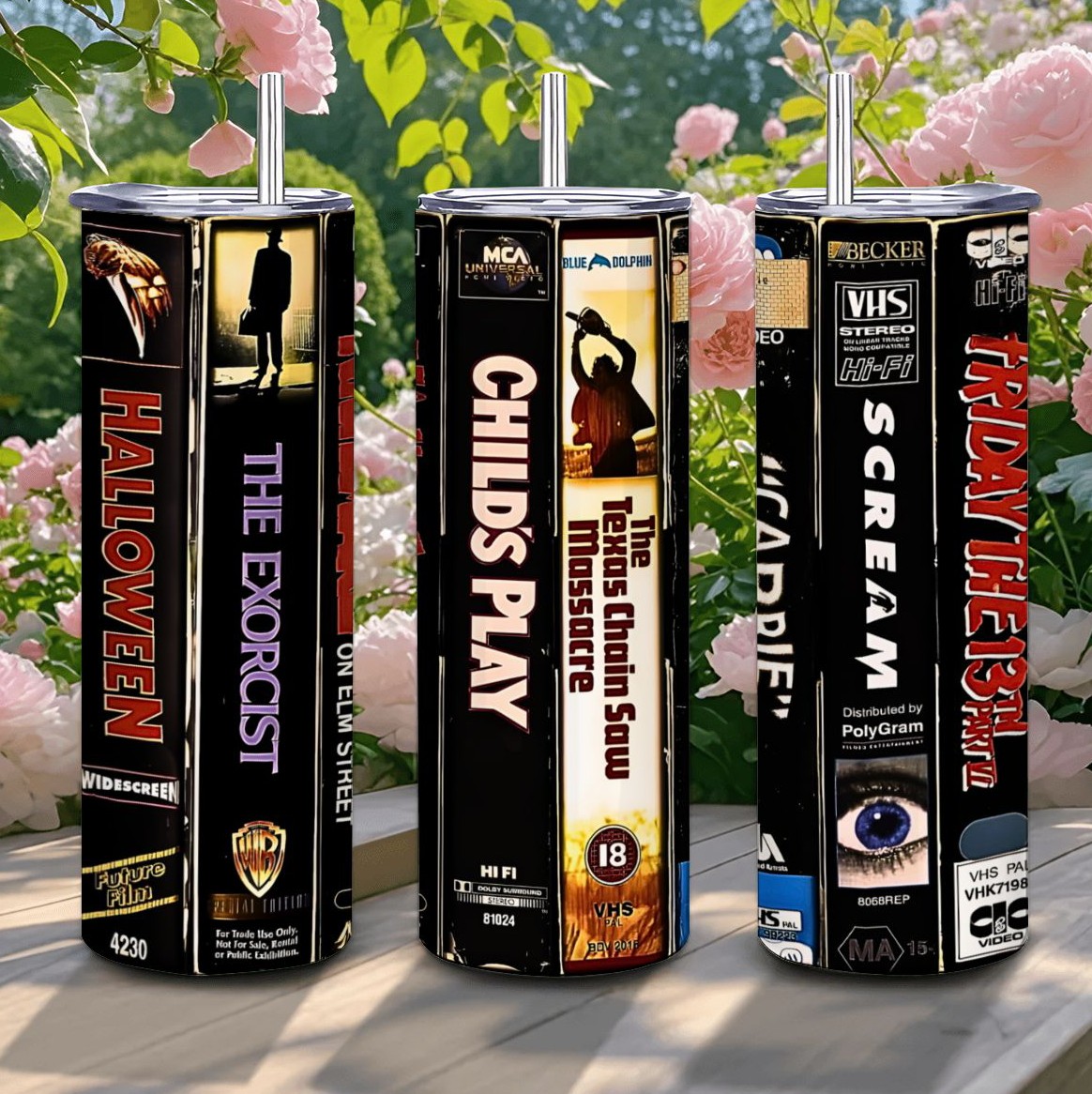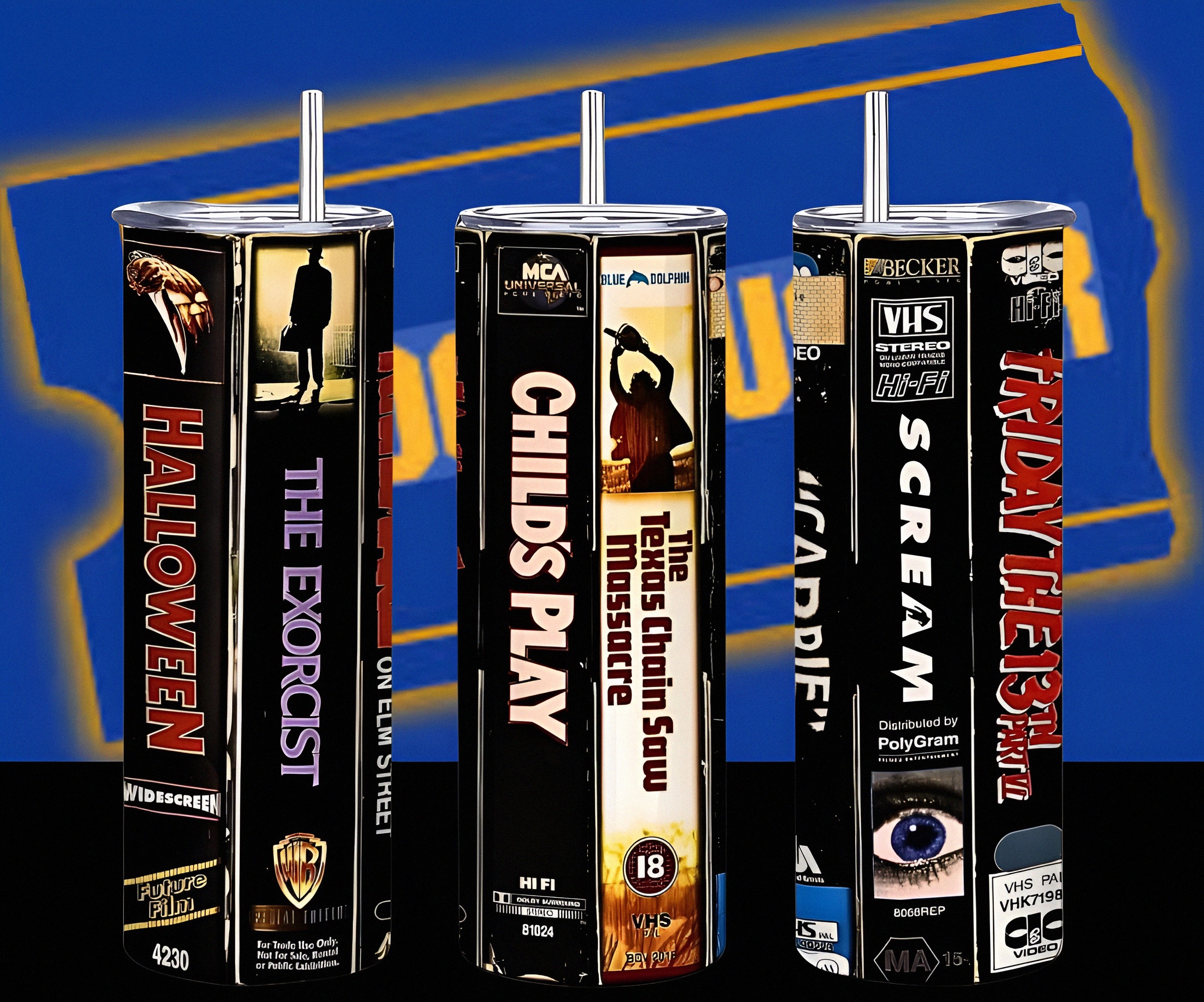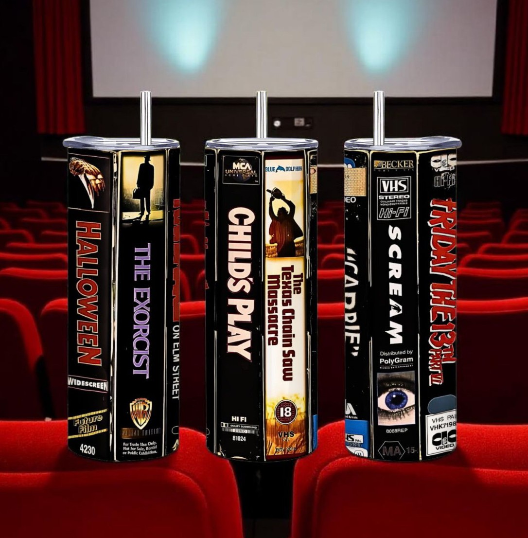 Take a trip back to the video store with this unique 20oz skinny tumbler! This design features the iconic VHS tape spines of classic horror movies like Halloween, The Exorcist, Child's Play, The Texas Chainsaw Massacre, Cujo, Scream, and Friday the 13th. Perfect for fans of vintage horror, slasher films, 80s and 90s nostalgia, and scary movie marathons. This stainless steel insulated tumbler keeps your drinks cold during a spooky night and makes an incredible gift for any horror collector. Comes with a straw, lid and cleaner.