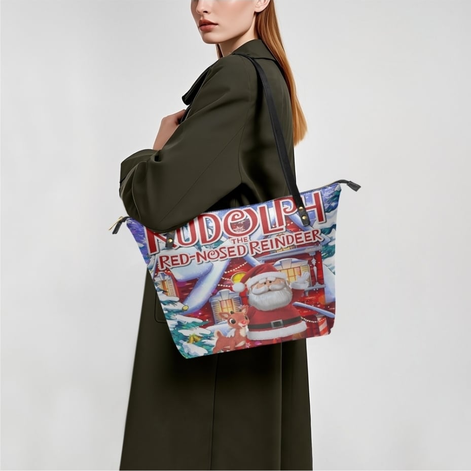 Carry the magic of the holidays with this unique Leather Tote Bag! This high-quality bag features a full-color, vibrant print of the classic Christmas movie, Rudolph The Red-Nosed Reindeer, showing Santa, Rudolph, and the festive North Pole setting.